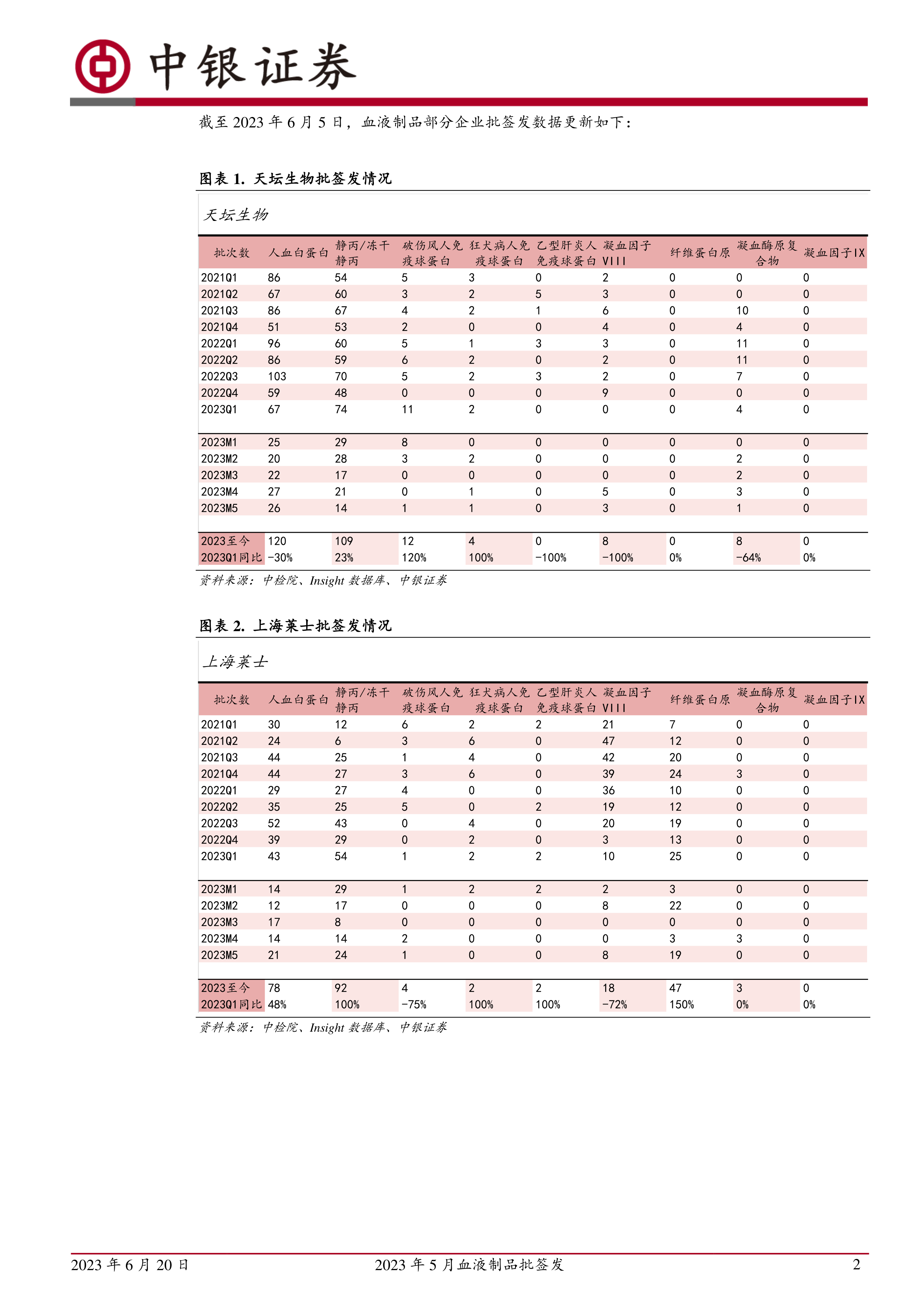 报告提供了多家血液制品企业(天坛生物、上海莱士、华兰生物、泰邦生物、博雅生物、派林生物、卫光生物等)以及进口人血白蛋白的2023年5月批签发数据图表(图表1-8)。这些图表直观地展现了各企业不同血液制品的批签发情况,为后续分析提供了数据基础。 数据显示,虽然部分产品在一季度表现良好,但二季度数据显示环比下滑趋势,这与新冠疫情对采浆量的影响密切相关。
