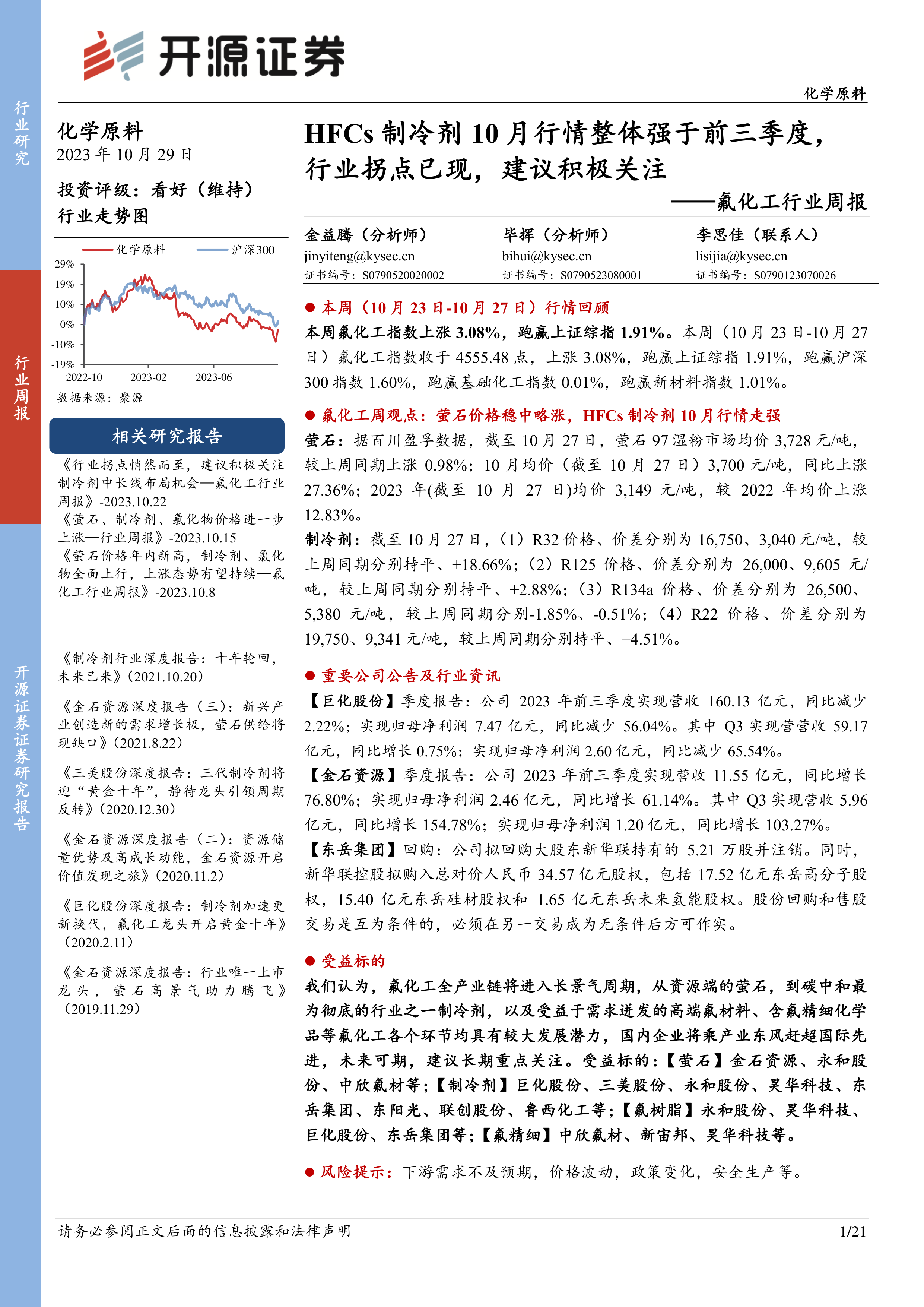 本报告的核心观点是:2023年10月氟化工行业,特别是HFCs制冷剂市场,整体表现强于前三季度,行业拐点已现,投资前景看好。 具体体现在: