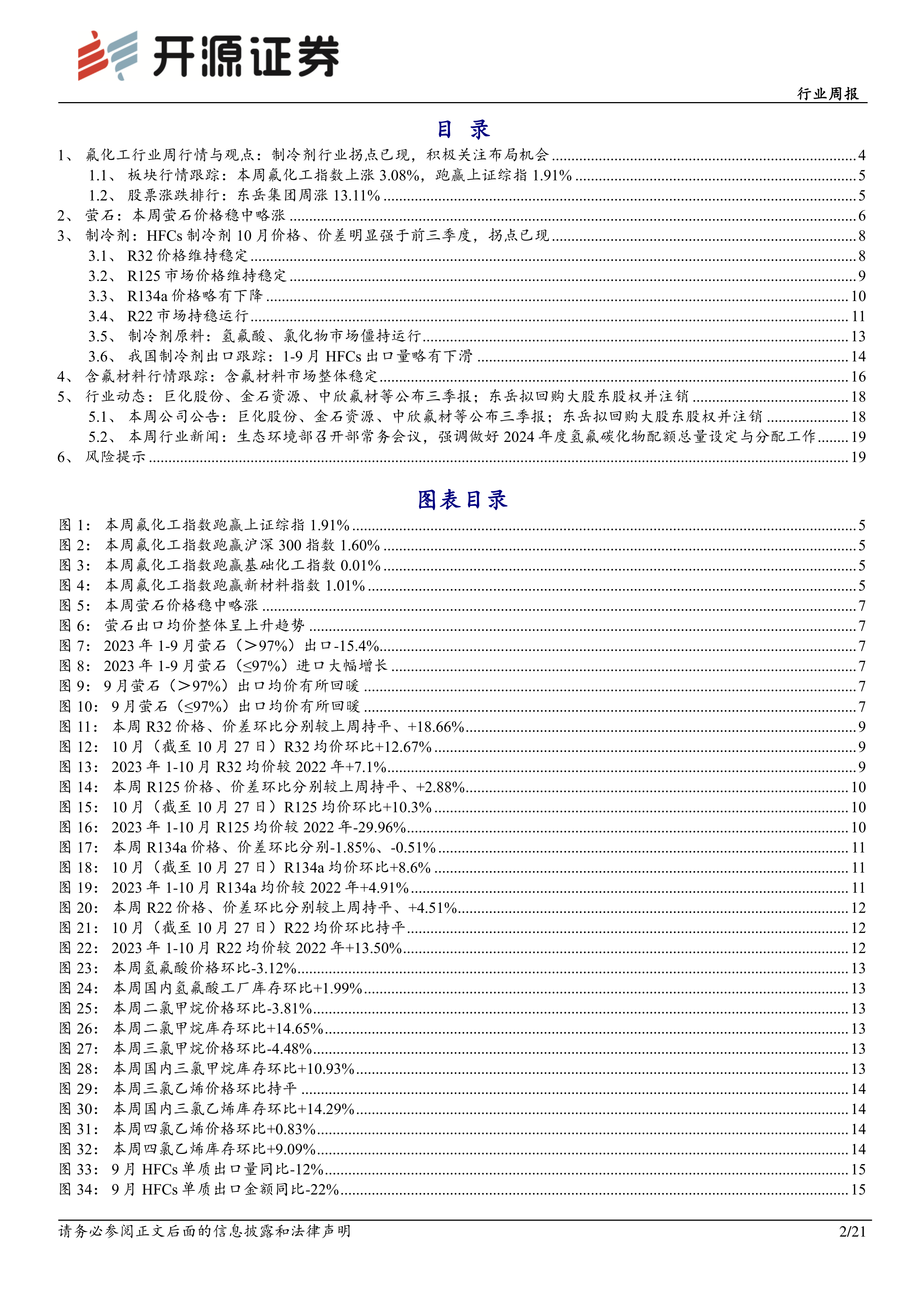 本报告通过对氟化工行业,特别是萤石和HFCs制冷剂市场的价格、产量、进出口数据以及行业政策的分析,得出结论:10月份氟化工行业整体表现强劲,HFCs制冷剂市场拐点已现,长期投资价值凸显。 HFCs制冷剂价格上涨主要受益于供需关系紧张和环保政策的推动,而萤石价格上涨则源于供给侧的收紧。 报告建议积极关注氟化工行业,特别是萤石和HFCs制冷剂相关上市公司,但同时也提示了下游需求不及预期、价格波动、政策变化和安全生产等风险。 2024年配额政策的执行将进一步推动行业发展,值得持续关注。