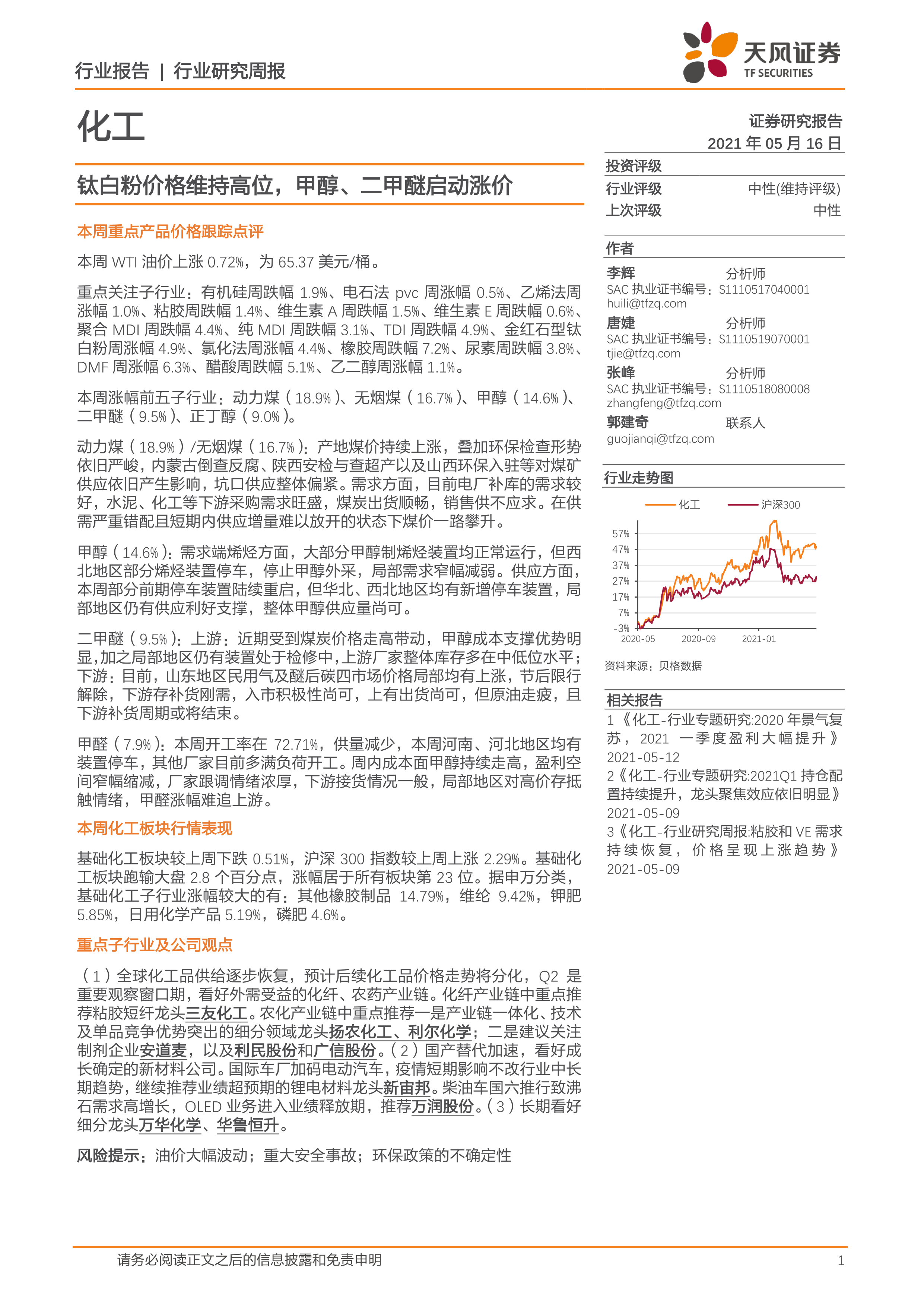 化工行业研究周报:钛白粉价格维持高位,甲醇、二甲醚启动涨价