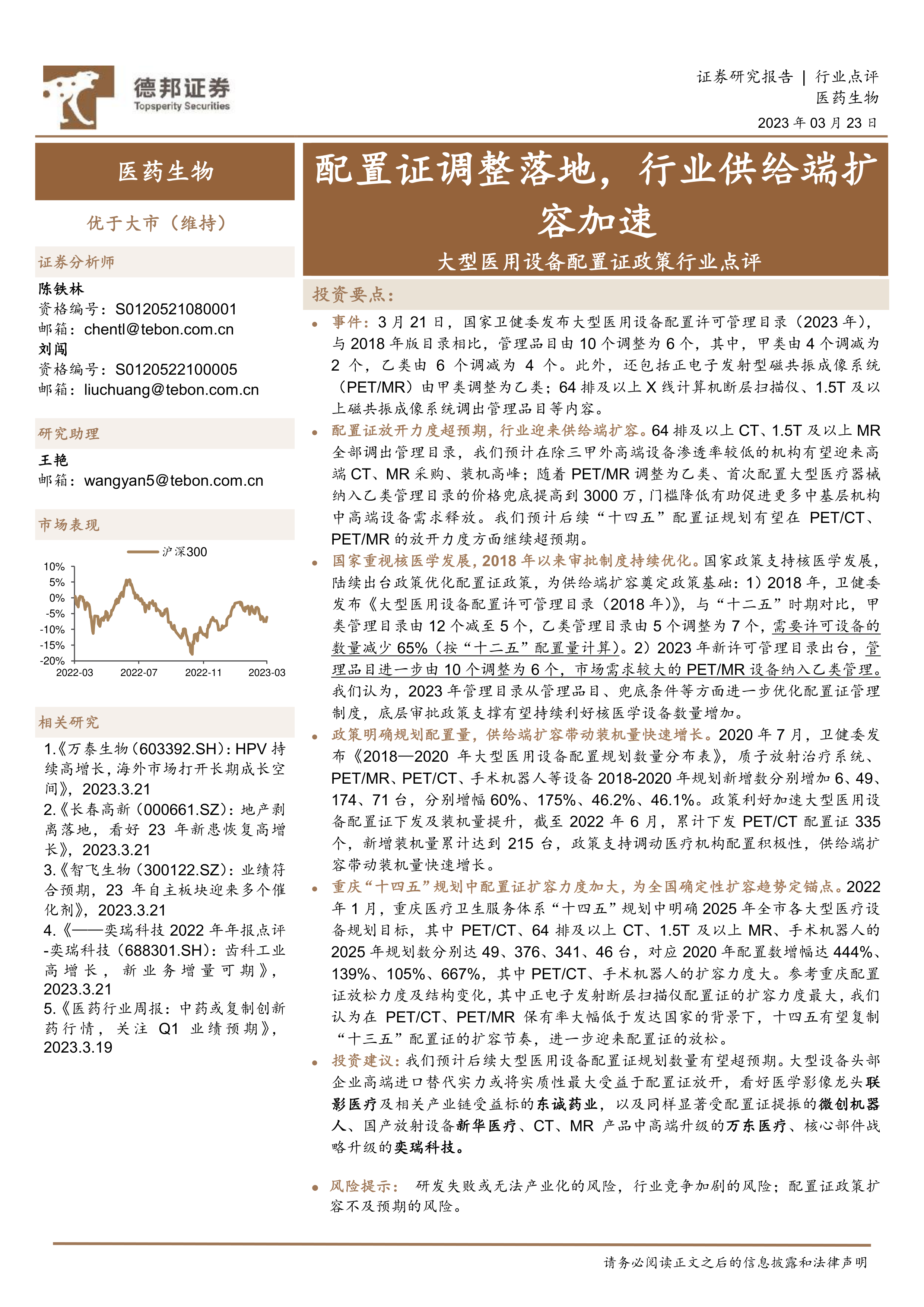 本报告基于2023年3月21日国家卫健委发布的《大型医用设备配置许可管理目录(2023年)》,对大型医用设备配置证政策调整进行了深入分析。 报告指出,此次政策调整力度超预期,将显著扩大医疗设备行业的供给端,并对相关企业产生积极影响。 通过对政策演变过程、规划数量以及重庆“十四五”规划的分析,报告论证了配置证政策持续优化的趋势,并为投资者提供了相应的投资建议和风险提示。 报告中大量的数据和图表,清晰地展现了政策调整对行业的影响,为投资者提供了专业的分析和参考。
