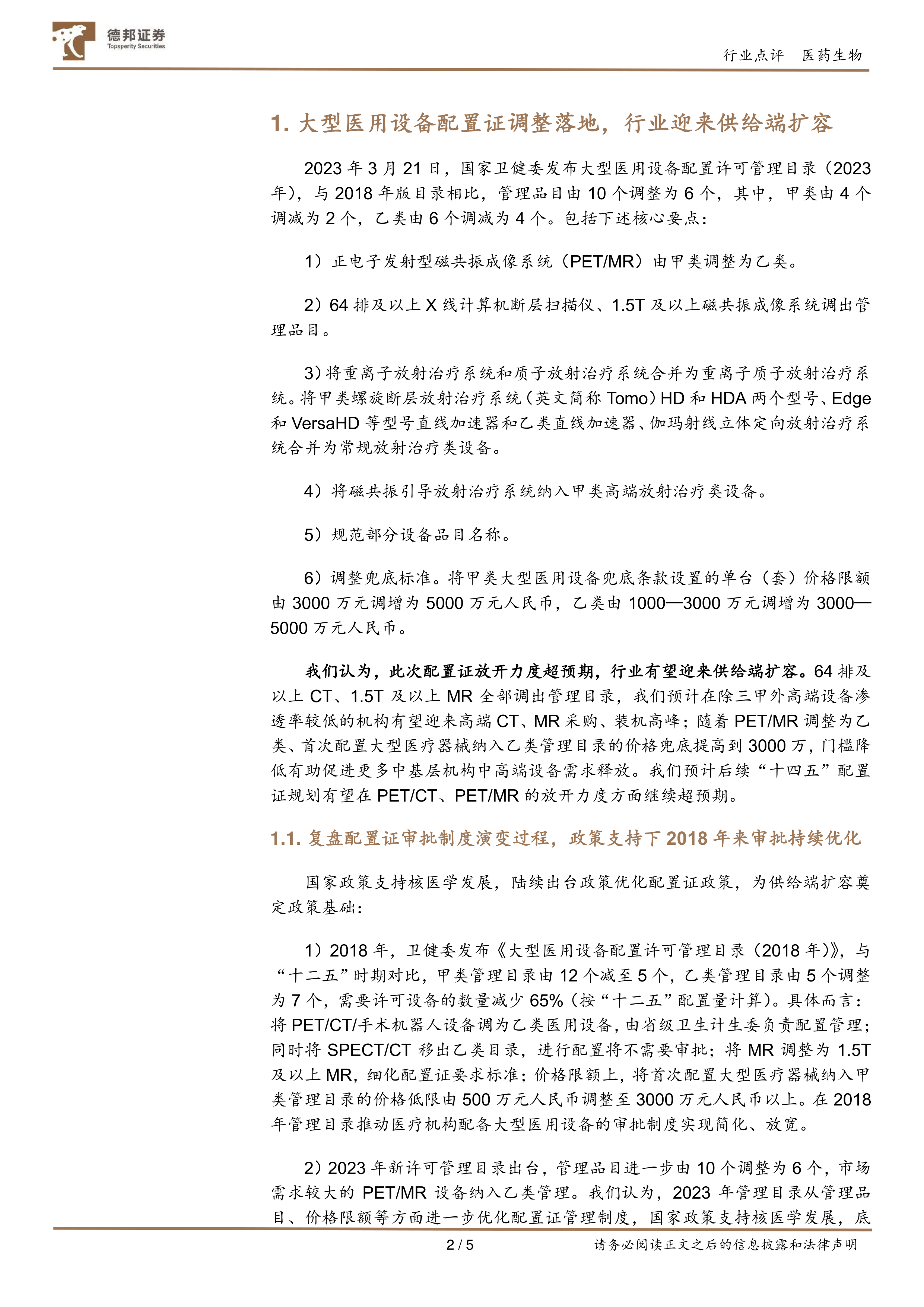 事件:3月21日,国家卫健委发布大型医用设备配置许可管理目录(2023年),与2018年版目录相比,管理品目由10个调整为6个,其中,甲类由4个调减为2个,乙类由6个调减为4个。此外,还包括正电子发射型磁共振成像系统(PET/MR)由甲类调整为乙类;64排及以上X线计算机断层扫描仪、1.5T及以上磁共振成像系统调出管理品目等内容。