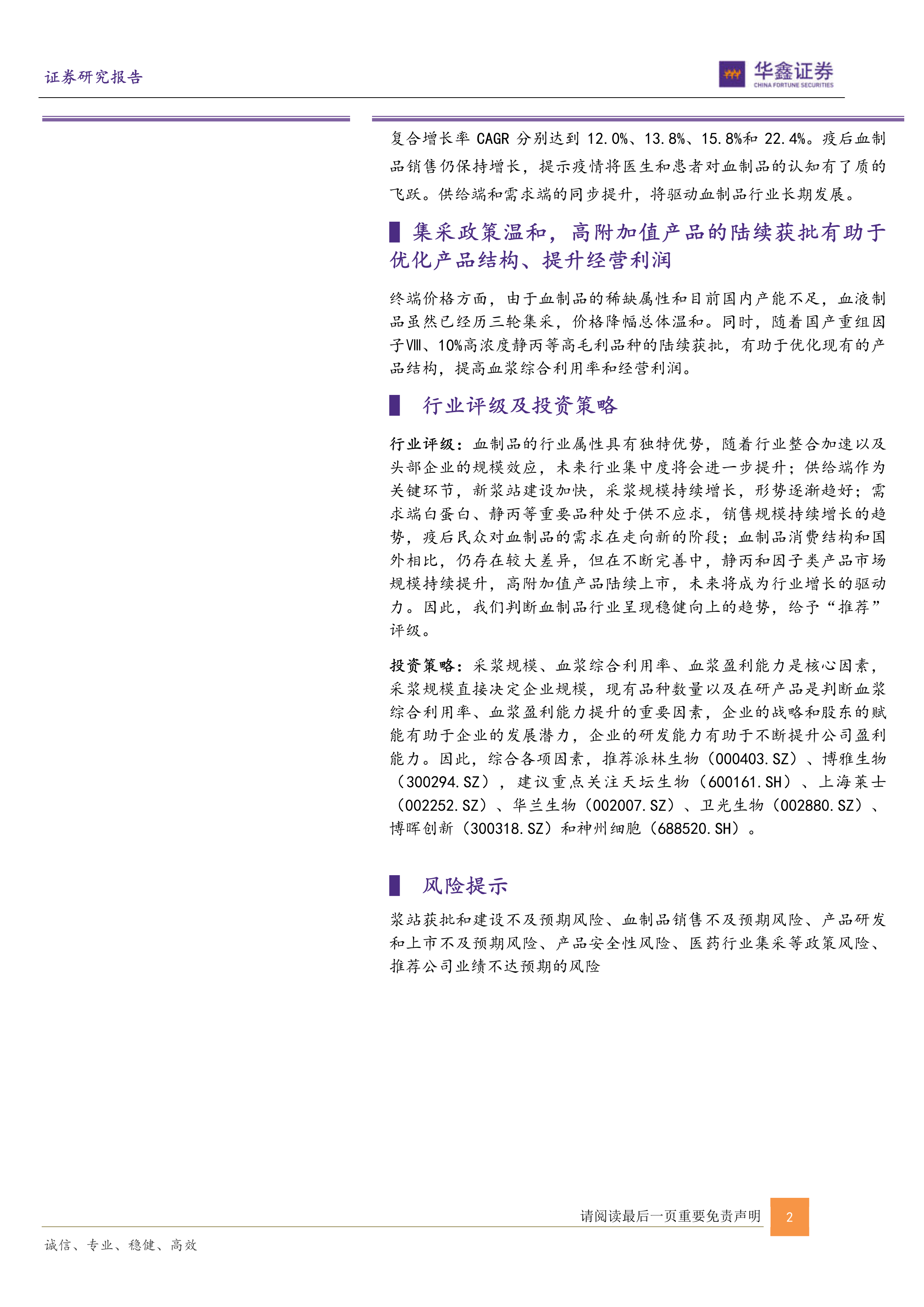报告最后给出了对中国血制品行业的投资评级和投资策略建议,给予“推荐”评级。 报告建议关注采浆规模、血浆综合利用率和血浆盈利能力等核心因素,并推荐了派林生物和博雅生物,同时建议重点关注天坛生物、上海莱士、华兰生物、卫光生物、博晖创新和神州细胞等公司。
