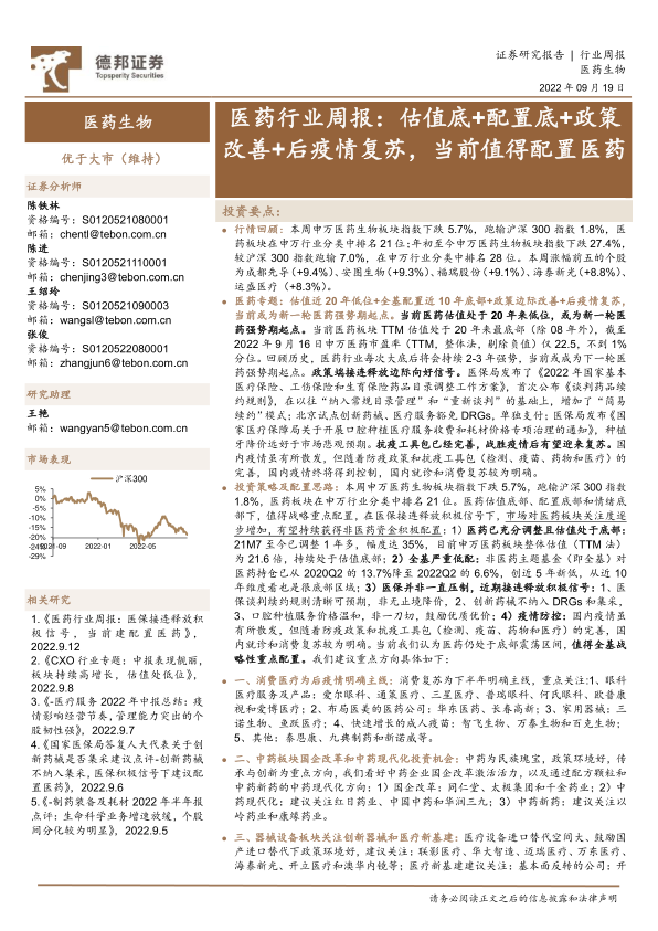 投资策略及配置思路:本周申万医药生物板块指数下跌5.7%,跑输沪深300指数1.8%,医药板块在申万行业分类中排名21位。医药估值底部、配置底部和情绪底部下,值得战略重点配置,在医保接连释放积极信号下,市场对医药板块关注度逐步增加,有望持续获得非医药资金积极配置:1)医药已充分调整且估值处于底部:21M7至今已调整1年多,幅度达35%,目前申万医药板块整体估值(TTM法)为21.6倍,持续处于估值底部;2)全基严重低配:非医药主题基金(即全基)对医药持仓已从2020Q2的13.7%降至2022Q2的6.6%,创近5年新低,从近10年维度看也是很底部区域;3)医保并非一直压制,近期接连释放积极信号:1、医保谈判续约规则清晰可预期,非无止境降价,2、创新药械不纳入DRGs和集采,3、口腔种植服务价格温和,非一刀切,鼓励优质优价;4)疫情防控:国内疫情虽有所散发,但随着防疫政策和抗疫工具包(检测、疫苗、药物和医疗)的完善,国内就诊和消费复苏较为明确。当前我们认为医药仍处于底部震荡区间,值得全基战略性重点配置。我们建议重点方向具体如下: