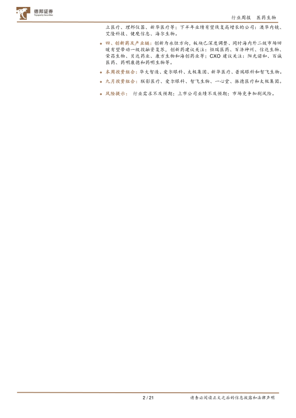 九月投资组合:联影医疗、爱尔眼科、智飞生物、一心堂、振德医疗和太极集团。