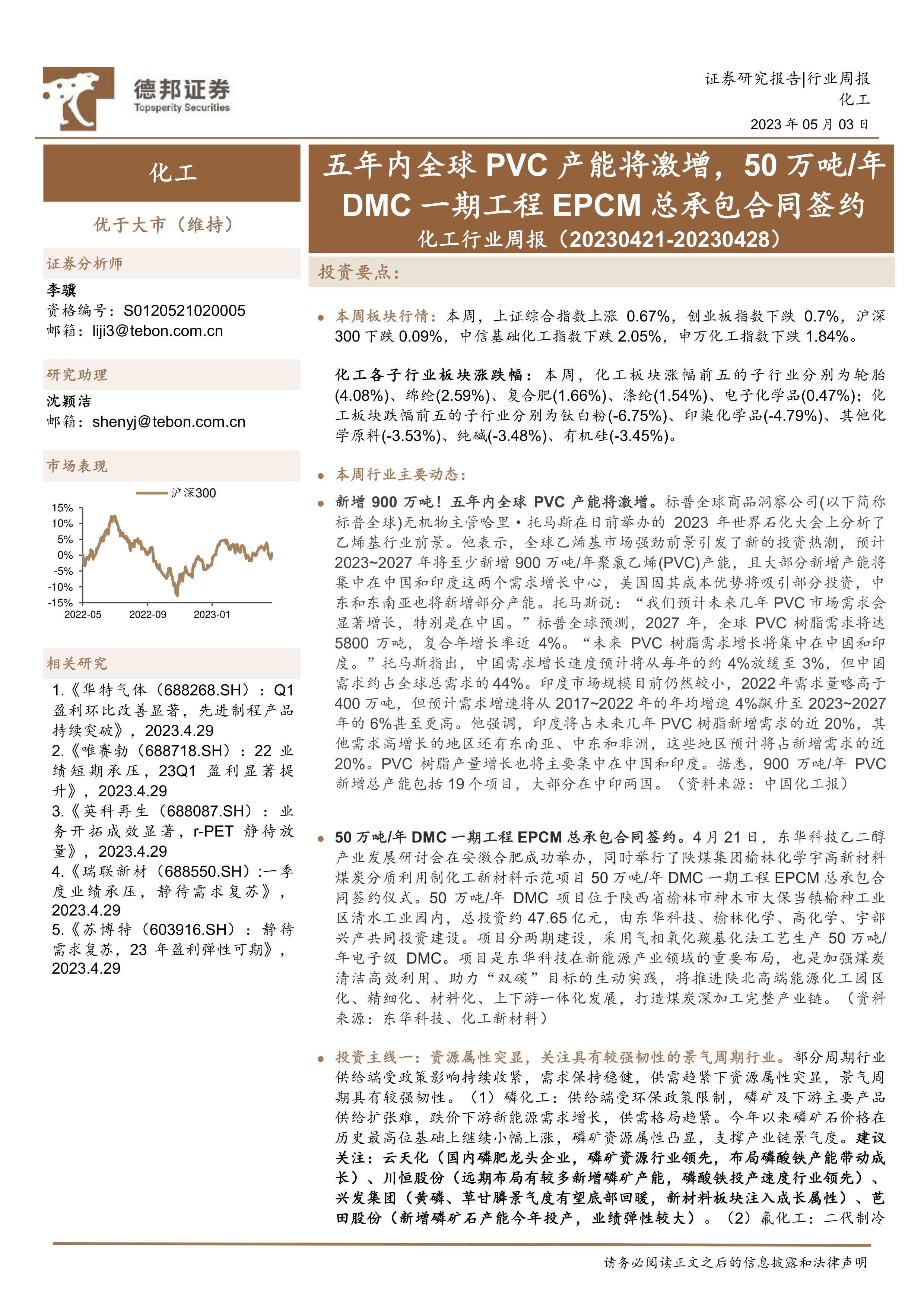 化工行业周报:五年内全球PVC产能将激增,50万吨/年DMC一期工程EPCM总承包合同签约