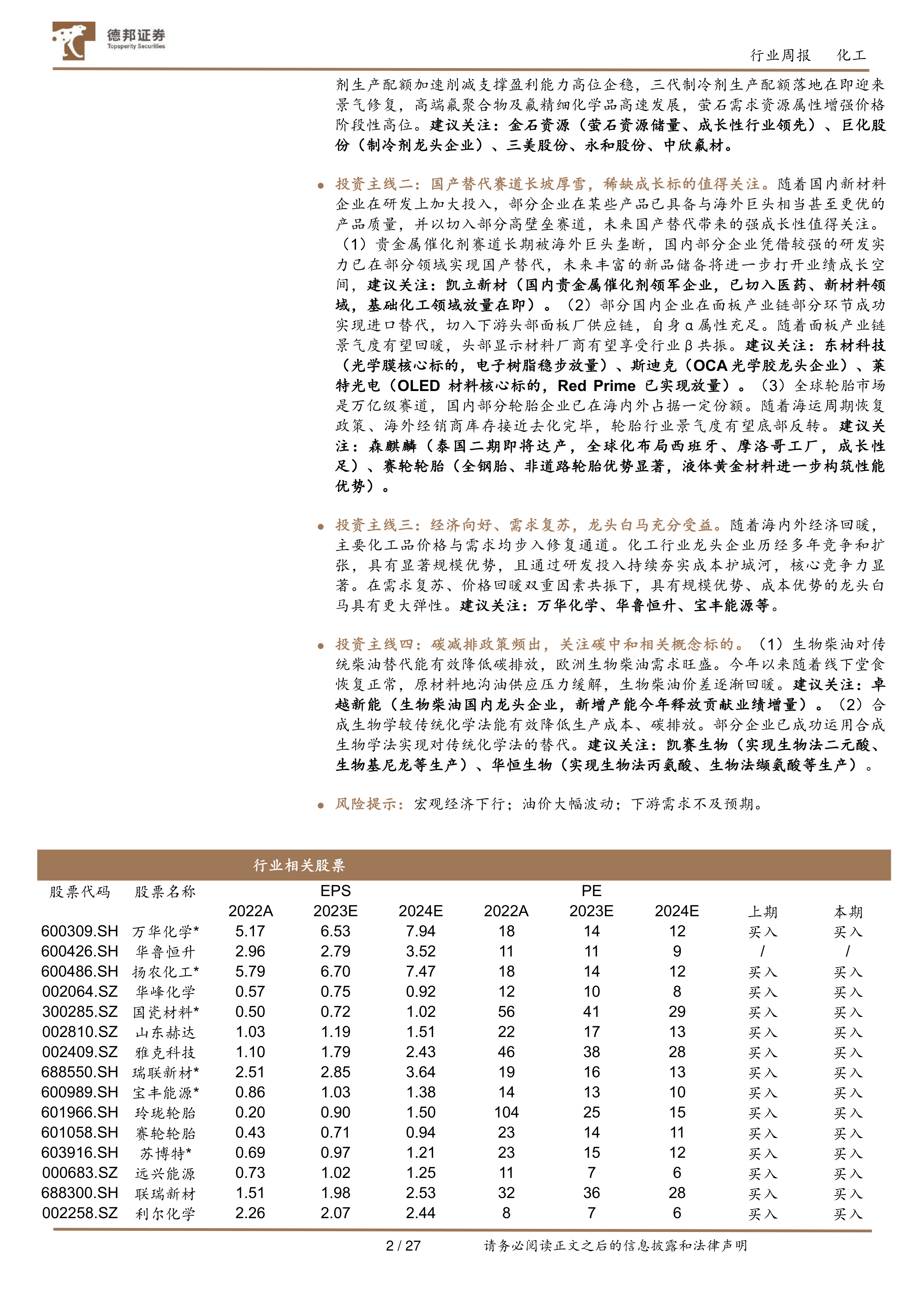 报告还列出了部分化工相关股票的EPS、PE等估值指标,以及德邦证券的投资评级。