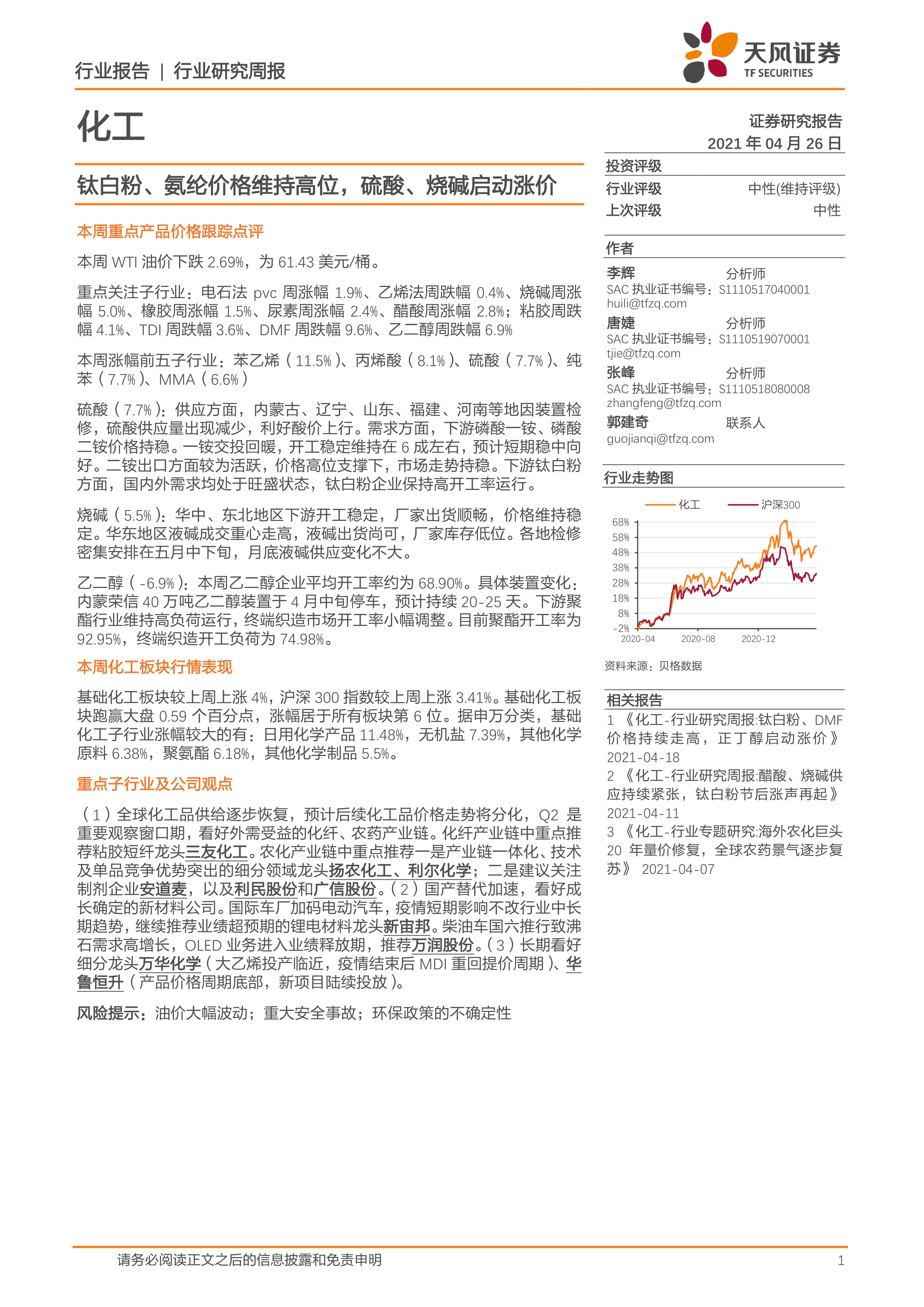 本报告的核心观点是:2021年4月26日,化工行业整体表现强劲,基础化工板块跑赢大盘,部分化工产品价格维持高位或启动涨价,但价格走势分化明显,Q2将是观察价格走势的关键时期。 具体而言,报告重点关注了钛白粉、氨纶价格维持高位,硫酸、烧碱启动涨价的现象,并对化纤、农药、新材料等子行业进行了分析,提出了相应的投资建议。