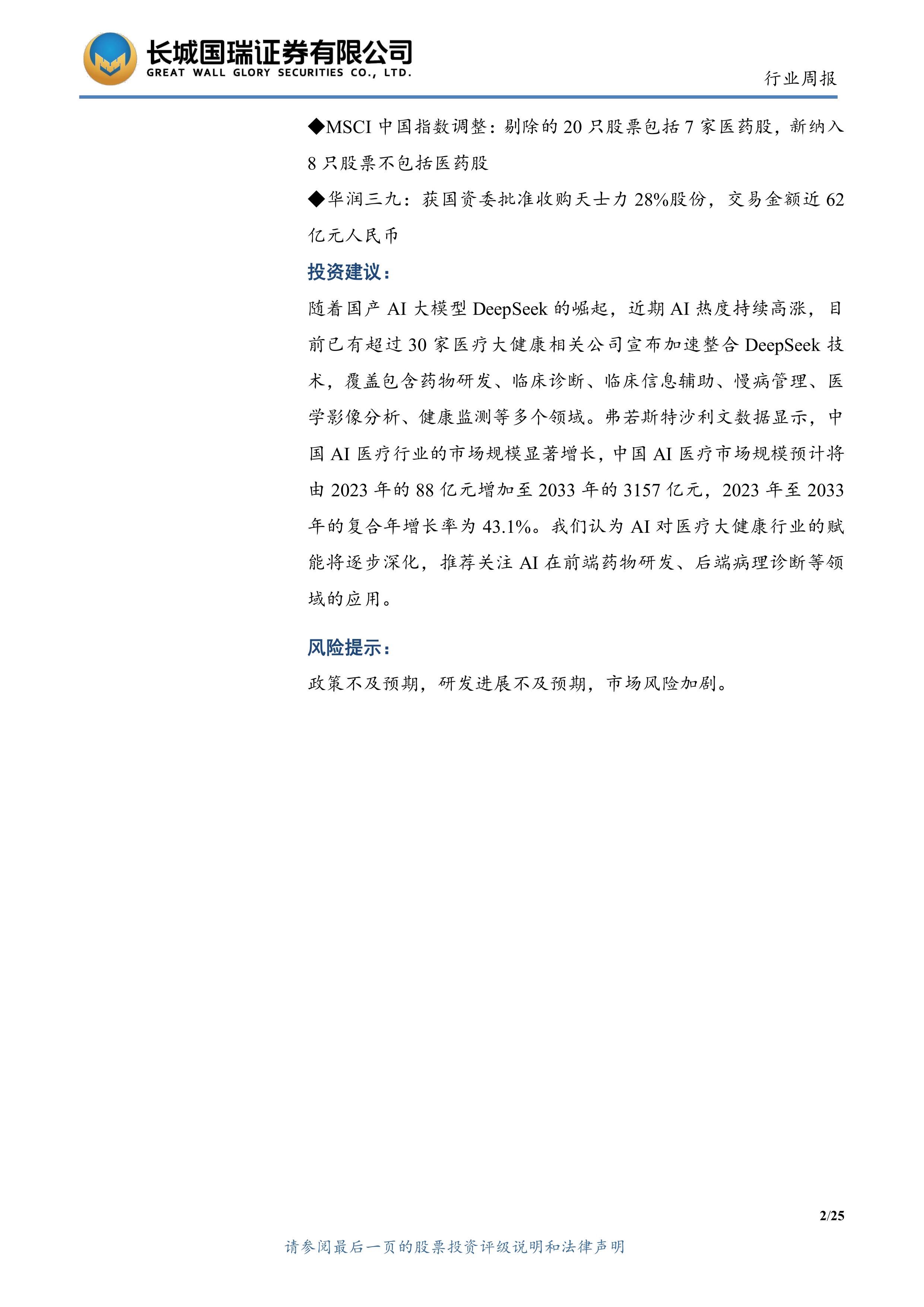 随着国产AI大模型DeepSeek的崛起,近期AI热度持续高涨,目前已有超过30家医疗大健康相关公司宣布加速整合DeepSeek技术,覆盖包含药物研发、临床诊断、临床信息辅助、慢病管理、医学影像分析、健康监测等多个领域。弗若斯特沙利文数据显示,中国AI医疗行业的市场规模显著增长,中国AI医疗市场规模预计将由2023年的88亿元增加至2033年的3157亿元,2023年至2033年的复合年增长率为43.1%。我们认为AI对医疗大健康行业的赋能将逐步深化,推荐关注AI在前端药物研发、后端病理诊断等领域的应用。