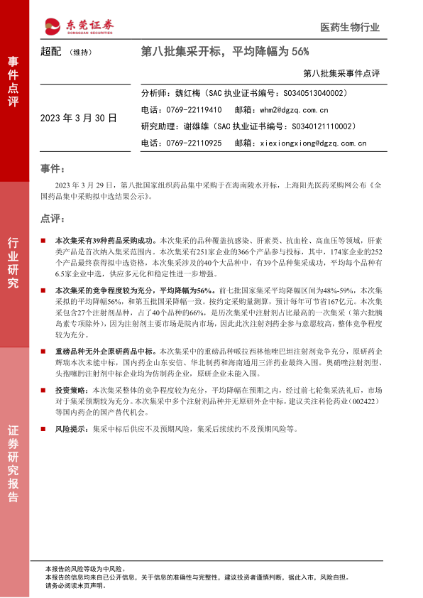 医药生物行业第八批集采事件点评:第八批集采开标,平均降幅为56%