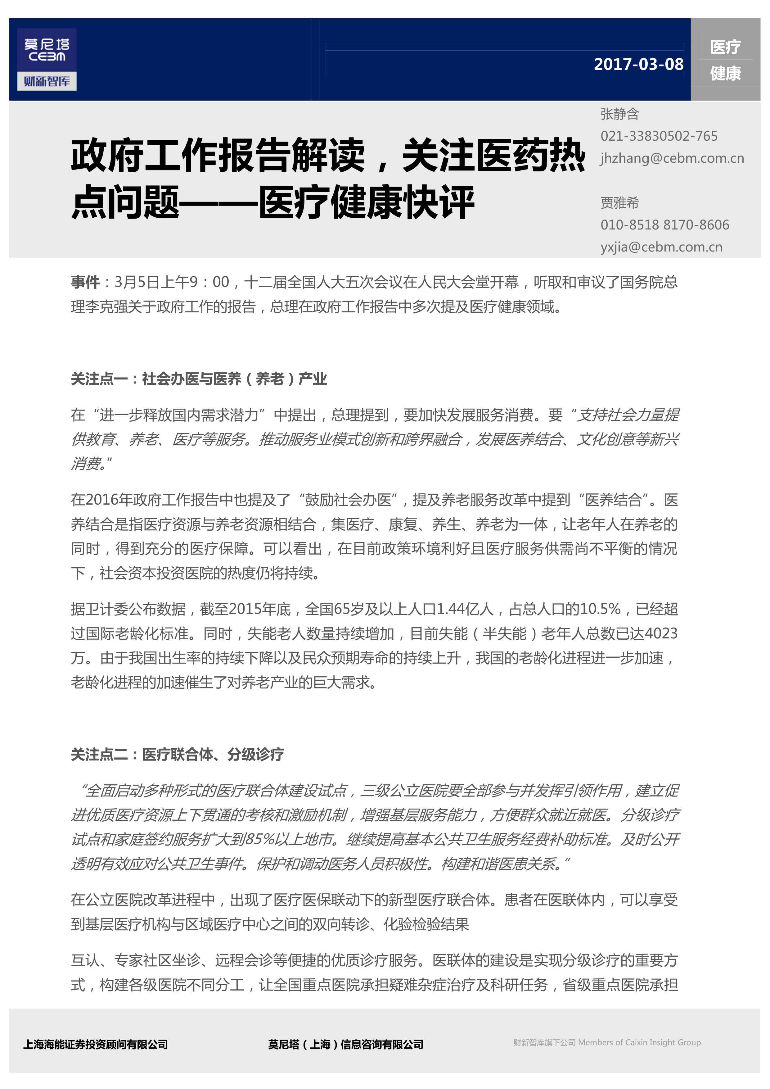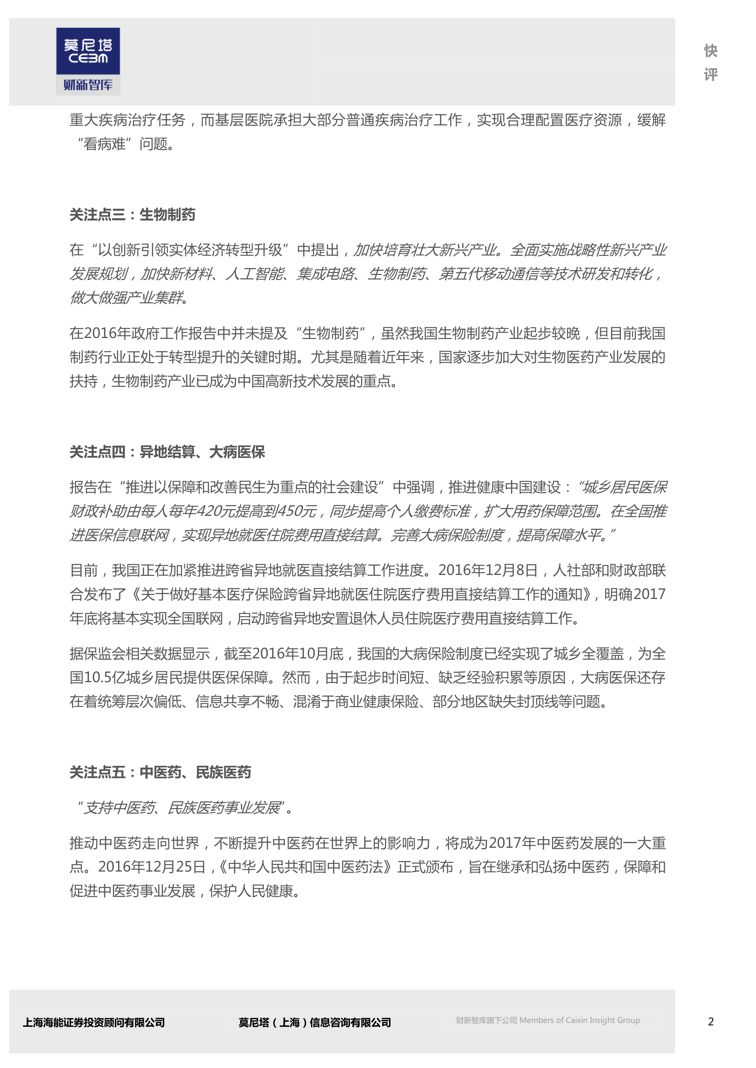 本报告分析了2017年政府工作报告中关于医疗健康领域的重点内容,并结合相关数据,对社会办医、医养结合、医疗联合体、分级诊疗、生物制药、异地结算、大病医保、中医药以及食品药品安全等九个方面进行了市场解读和分析。报告的核心观点是:政府工作报告中对医疗健康领域的重视程度空前提高,一系列政策利好将推动医疗健康产业快速发展,但也存在一些挑战,例如大病医保体系的完善、医联体建设的推进以及食品药品安全的监管等。