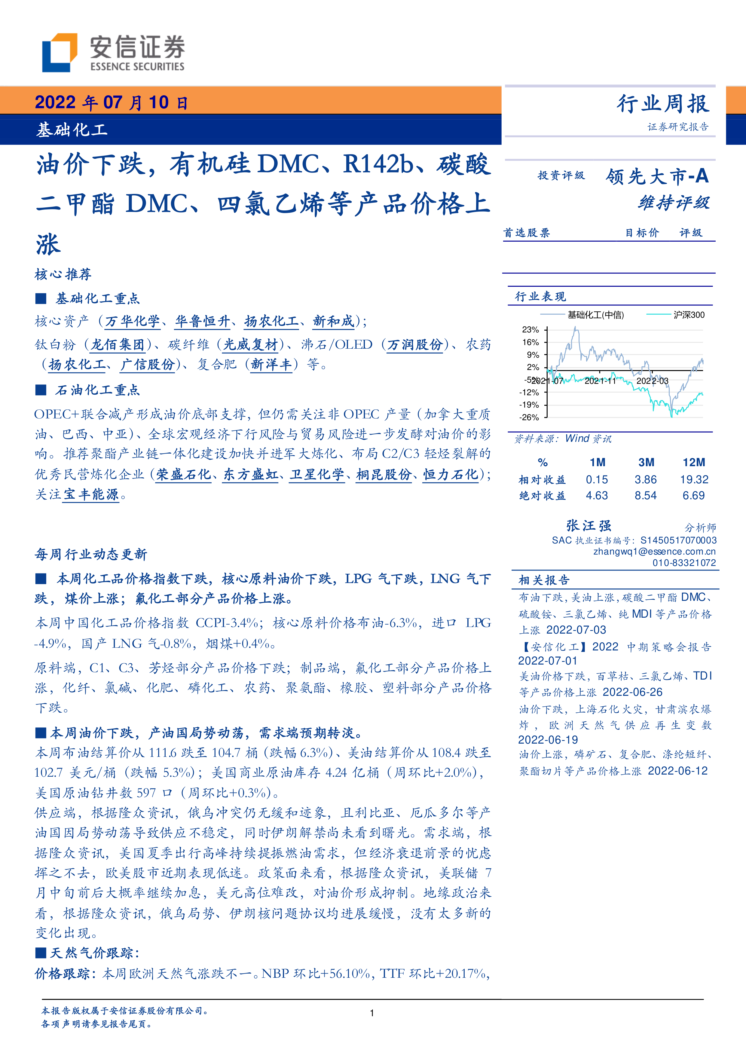 本报告的核心观点是:7月10日基础化工行业周报显示,油价下跌对部分化工产品价格造成影响,但部分产品价格上涨,市场波动较大。 具体而言,报告分析了油价波动、天然气价格变化以及重点化工产品价格涨跌幅度,并对有机硅DMC、R142b、碳酸二甲酯DMC等产品的价格波动进行了深入分析,指出下游需求、厂商检修和生产能力等因素是影响价格波动的关键。报告维持对基础化工行业的“领先大市-A”评级。
