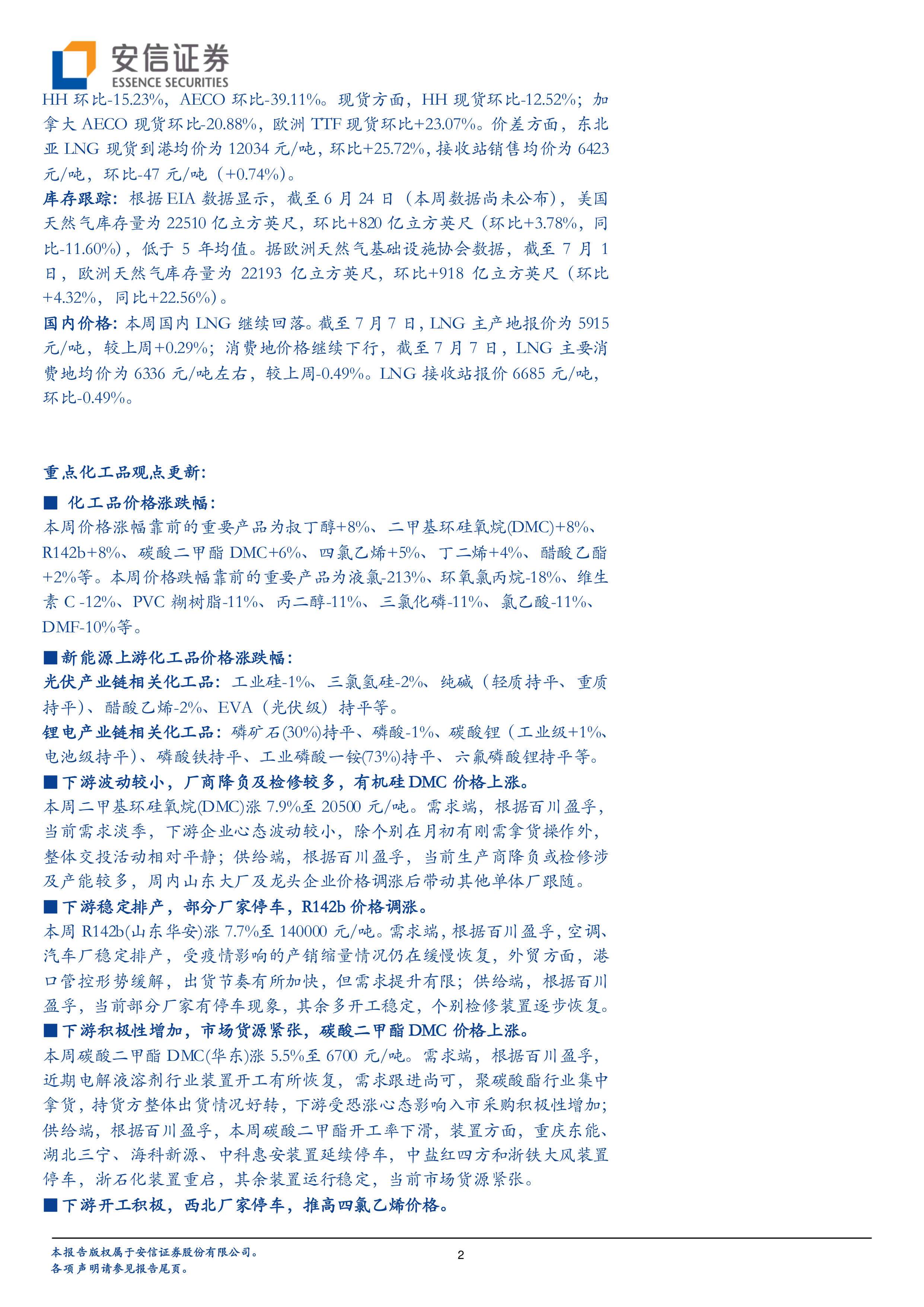 报告重点关注了有机硅DMC、R142b、碳酸二甲酯DMC和四氯乙烯等产品的价格波动。这些产品的价格上涨主要受到下游需求、厂商检修和生产能力等因素的影响。例如,DMC价格上涨是由于下游需求增加和部分生产商停车检修导致的供给减少。R142b价格上涨则是因为下游空调和汽车厂稳定排产,而部分厂家停车检修。 其他化工产品价格则呈现出不同的走势,部分产品价格上涨,部分产品价格下跌,反映了市场供需关系的复杂性。