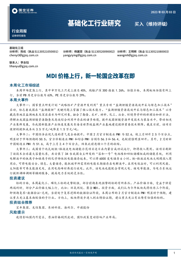 基础化工行业研究:MDI价格上行,新一轮国企改革在即