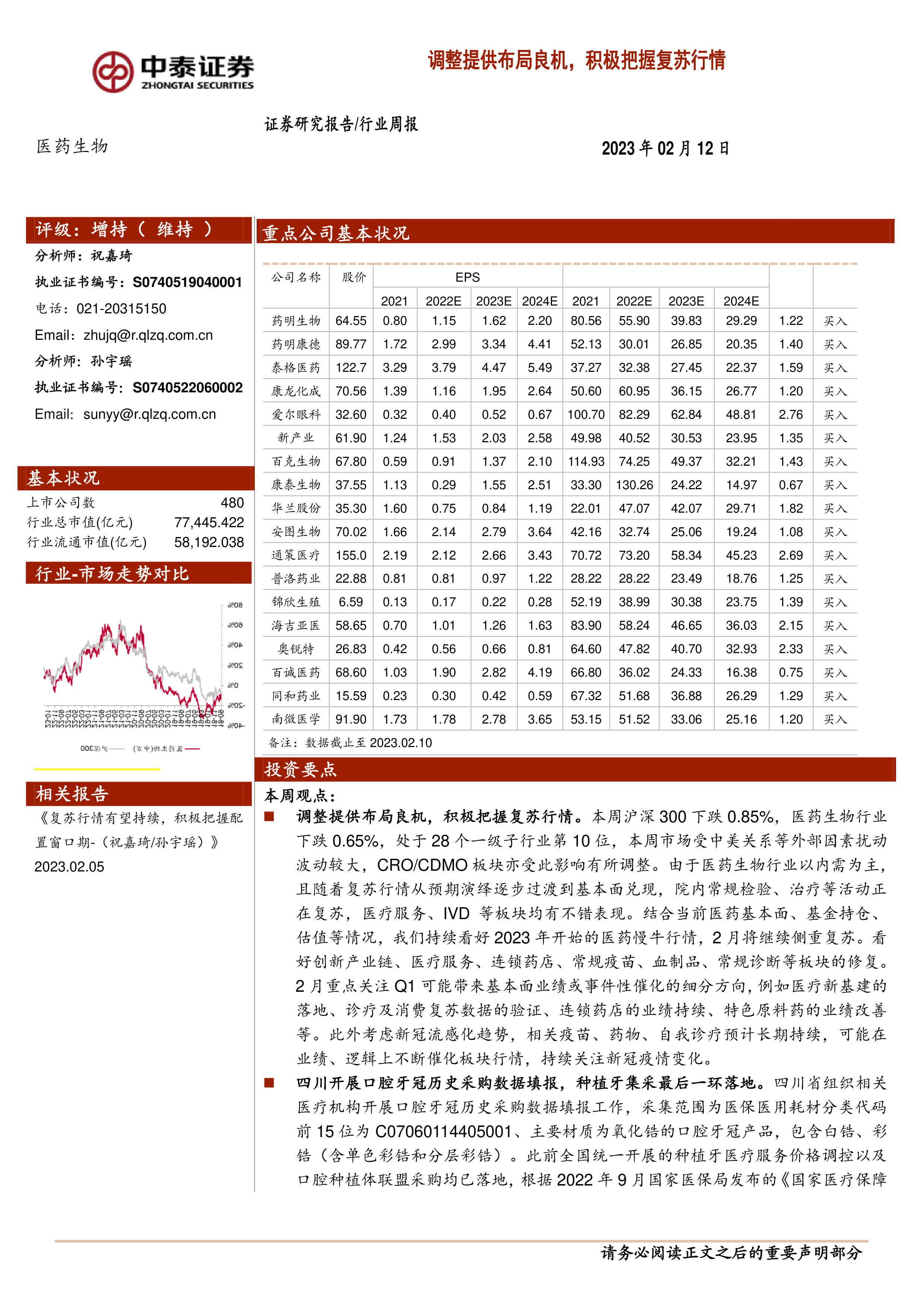 调整提供布局良机,积极把握复苏行情。本周沪深300下跌0.85%,医药生物行业下跌0.65%,处于28个一级子行业第10位,本周市场受中美关系等外部因素扰动波动较大,CRO/CDMO板块亦受此影响有所调整。由于医药生物行业以内需为主,且随着复苏行情从预期演绎逐步过渡到基本面兑现,院内常规检验、治疗等活动正在复苏,医疗服务、IVD等板块均有不错表现。结合当前医药基本面、基金持仓、估值等情况,我们持续看好2023年开始的医药慢牛行情,2月将继续侧重复苏。看好创新产业链、医疗服务、连锁药店、常规疫苗、血制品、常规诊断等板块的修复。2月重点关注Q1可能带来基本面业绩或事件性催化的细分方向,例如医疗新基建的落地、诊疗及消费复苏数据的验证、连锁药店的业绩持续、特色原料药的业绩改善等。此外考虑新冠流感化趋势,相关疫苗、药物、自我诊疗预计长期持续,可能在业绩、逻辑上不断催化板块行情,持续关注新冠疫情变化。