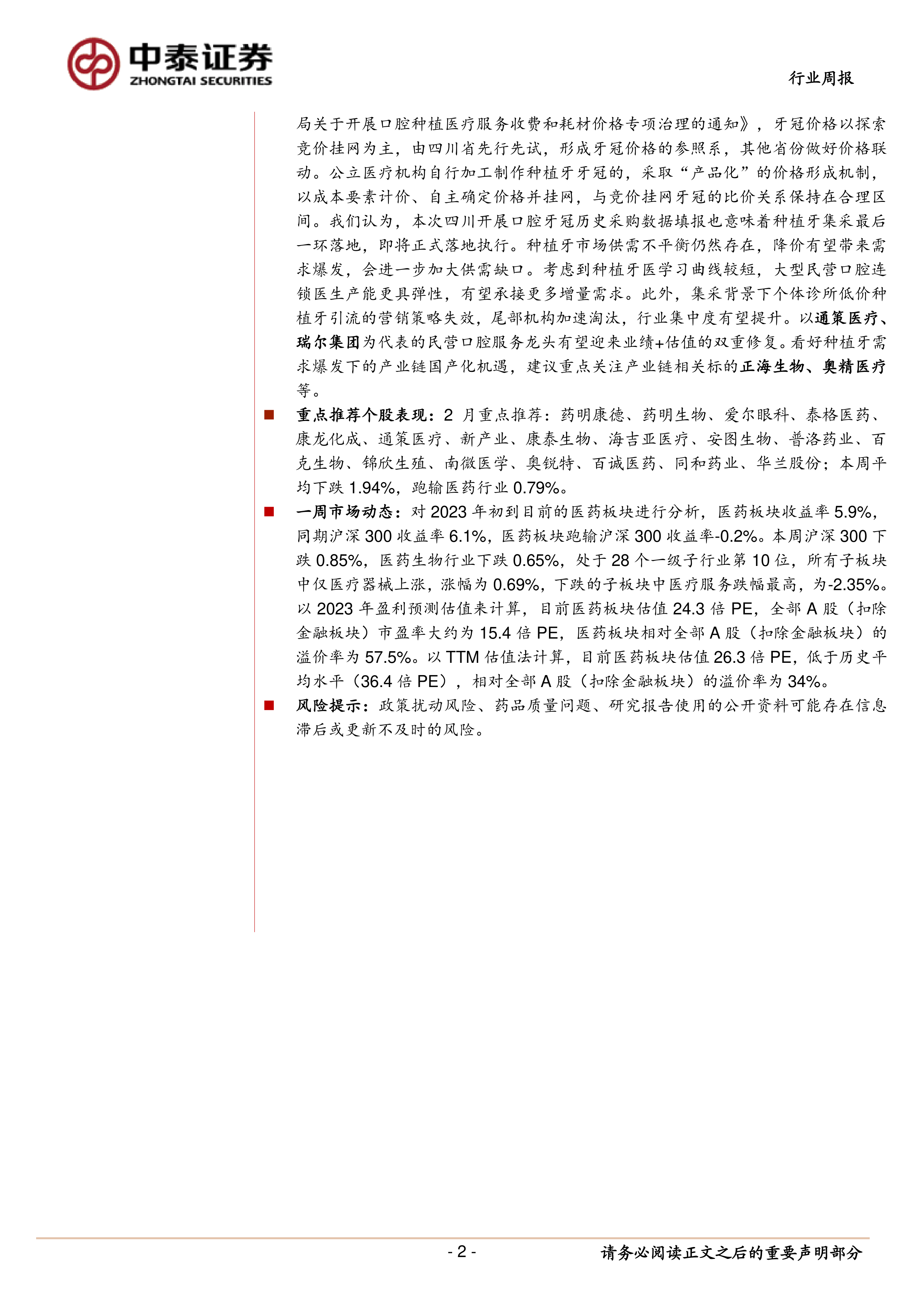 本报告对2023年2月医药生物行业进行了全面分析,指出行业复苏态势良好,并重点关注了种植牙集采落地带来的产业链机遇。报告基于市场数据和基本面分析,对重点个股和行业板块进行了推荐,并提供了相关政策解读和公司动态信息。投资者应结合自身风险承受能力和投资目标,谨慎决策。 报告也提示了政策扰动风险、药品质量问题以及信息滞后等风险因素。
