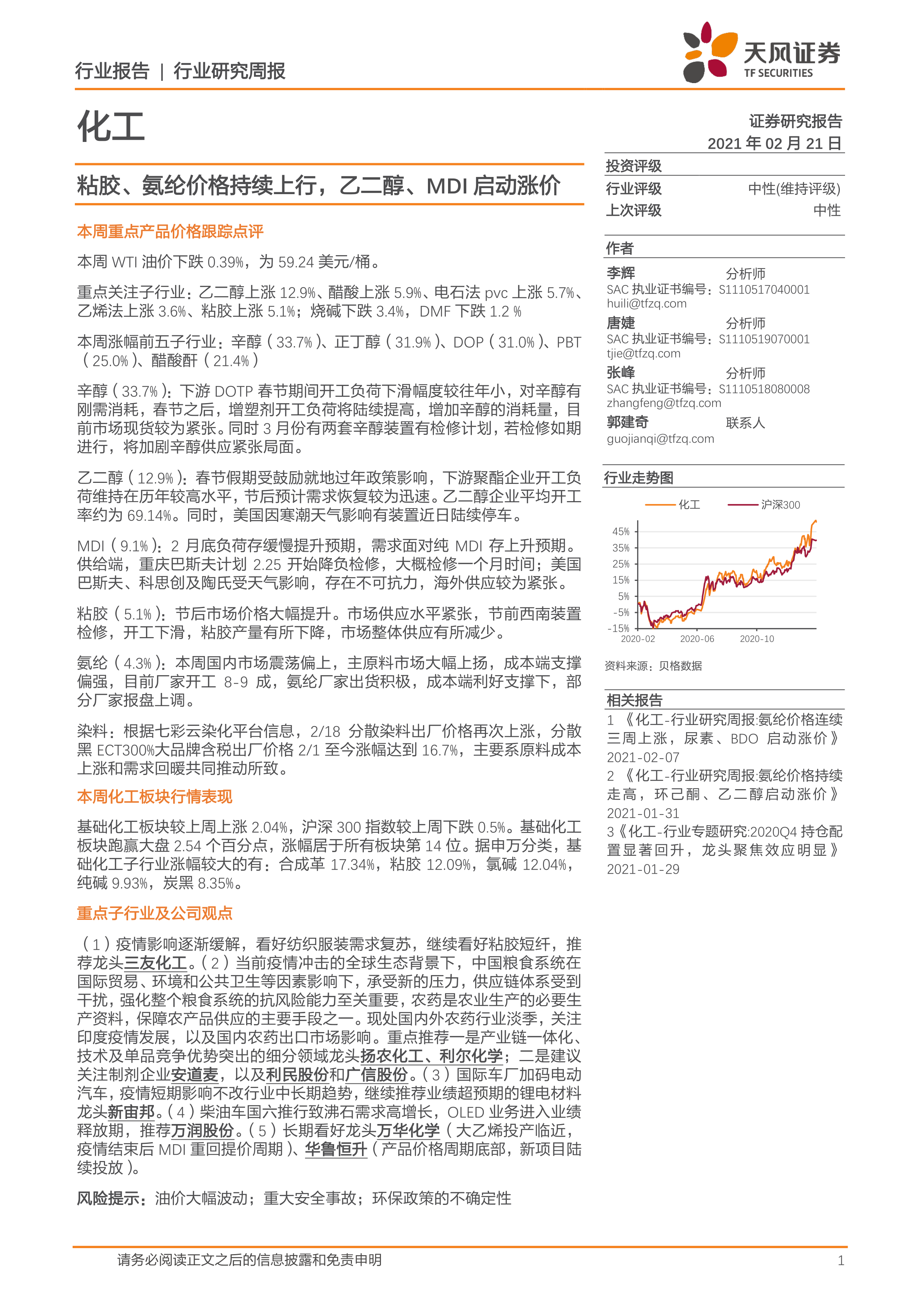 本报告的核心观点是:2021年2月第3周,化工行业整体表现强劲,基础化工板块跑赢大盘,多个重点化工产品价格持续上涨,其中辛醇、正丁醇、DOP涨幅居前。粘胶、氨纶价格持续上行,乙二醇、MDI也启动涨价,这主要受益于下游需求复苏和供应紧张等因素。报告同时对重点子行业及公司进行了分析,并提出了投资建议。