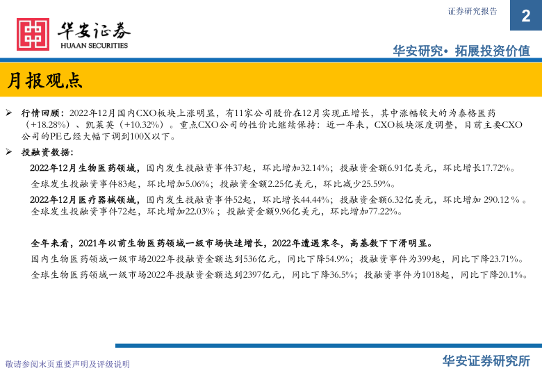 本报告的核心观点是:2022年12月,中国CXO板块市场出现回暖迹象,融资端探底回升,板块回升可期。这一回暖主要源于药明生物UVL清单的全面解除,国际关系担忧的消退以及医药行业政策的持续改善,创新药景气度提升。然而,2022年全年生物医药领域一级市场投融资遭遇寒冬,投融资金额和事件数量均出现大幅下降。报告建议关注龙头CXO企业以及临床CRO、新兴优质赛道等细分领域。