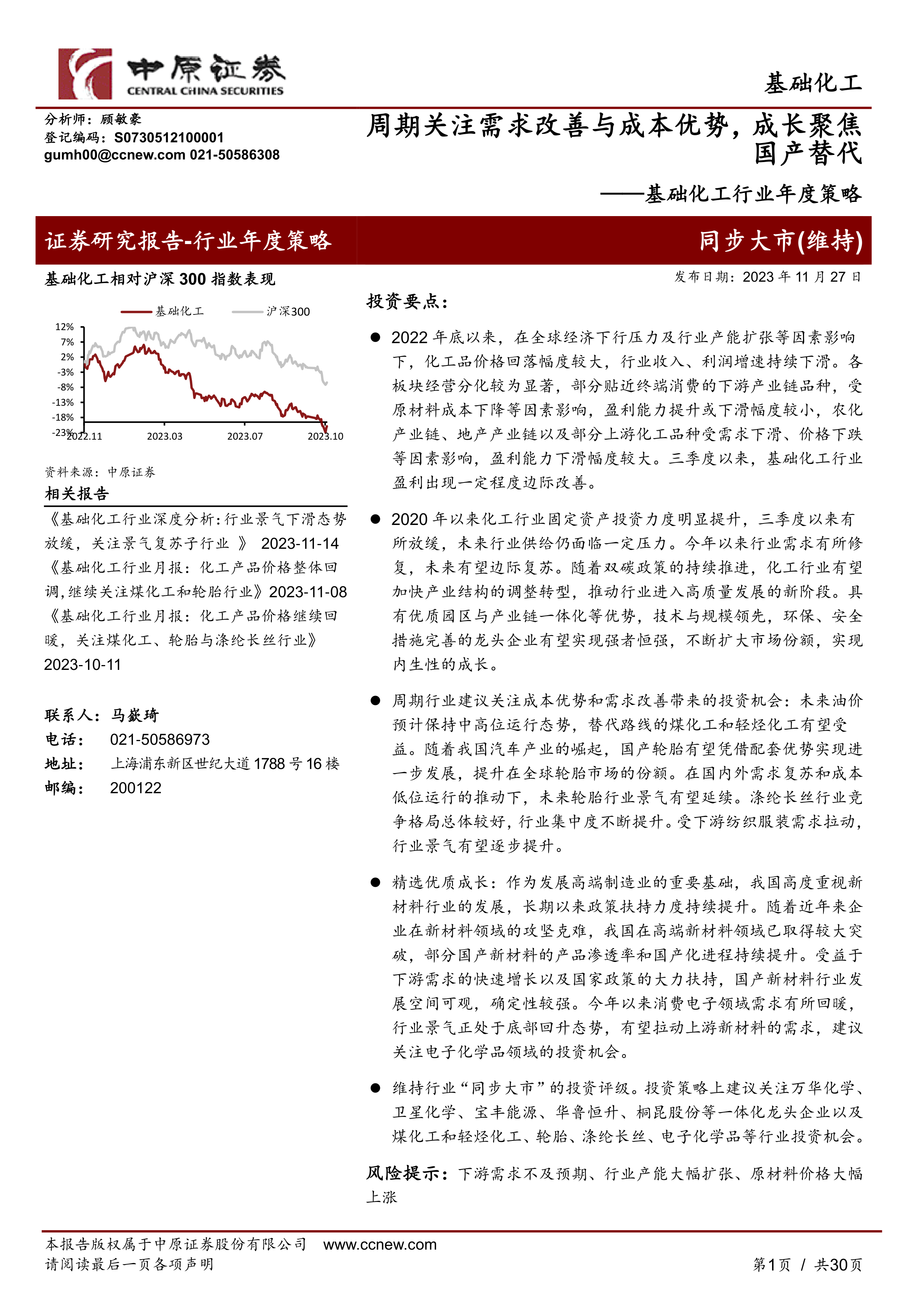 维持行业“同步大市”的投资评级。投资策略上建议关注万华化学、卫星化学、宝丰能源、华鲁恒升、桐昆股份等一体化龙头企业以及煤化工和轻烃化工、轮胎、涤纶长丝、电子化学品等行业投资机会。