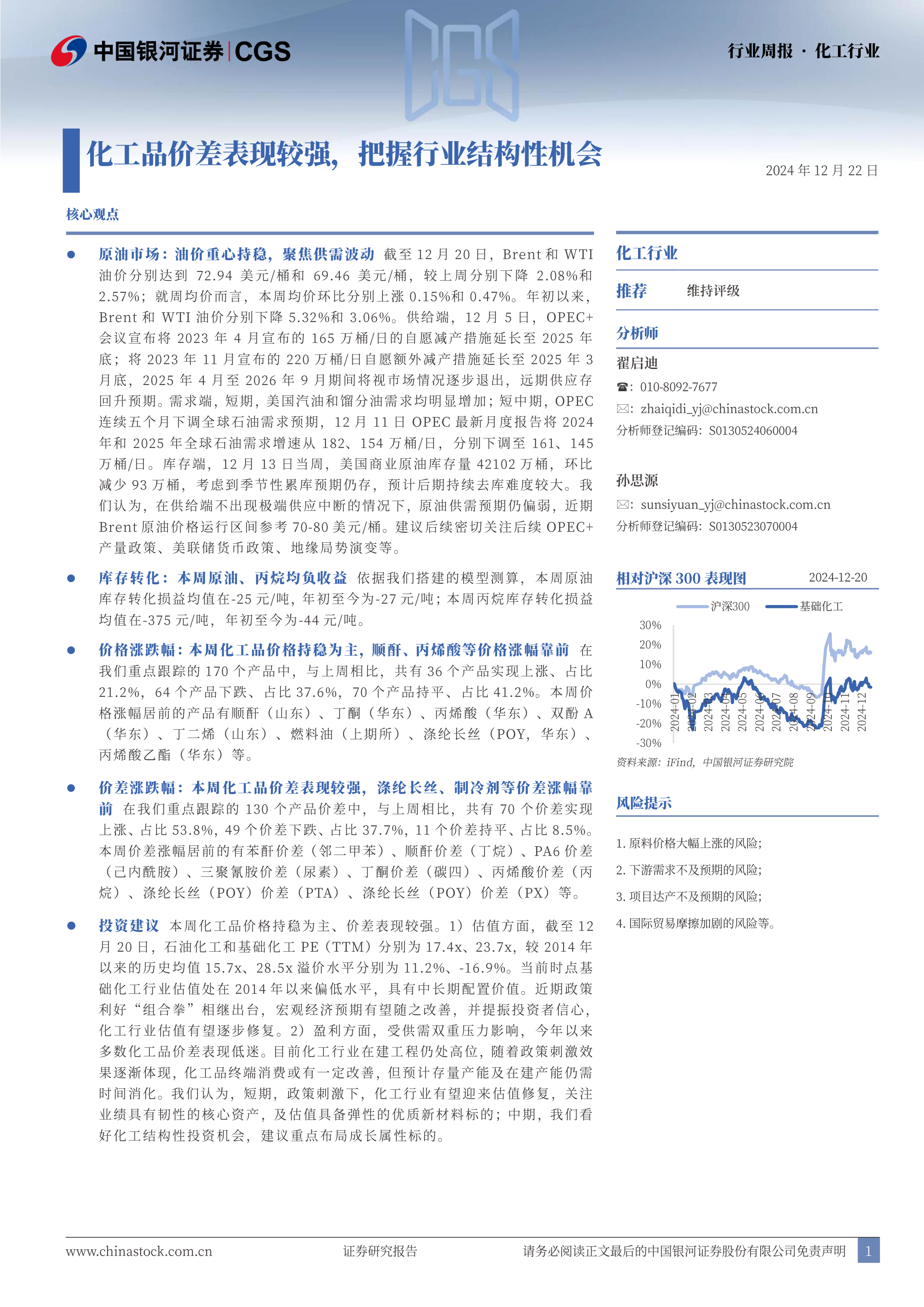 投资建议:本周化工品价格持稳为主、价差表现较强。1)估值方面,截至12月20日,石油化工和基础化工PE(TTM)分别为17.4x、23.7x,较2014年以来的历史均值15.7x、28.5x溢价水平分别为11.2%、-16.9%。当前时点基础化工行业估值处在2014年以来偏低水平,具有中长期配置价值。近期政策利好“组合拳”相继出台,宏观经济预期有望随之改善,并提振投资者信心,化工行业估值有望逐步修复。2)盈利方面,受供需双重压力影响,今年以来多数化工品价差表现低迷。目前化工行业在建工程仍处高位,随着政策刺激效果逐渐体现,化工品终端消费或有一定改善,但预计存量产能及在建产能仍需时间消化。我们认为,短期,政策刺激下,化工行业有望迎来估值修复,关注业绩具有韧性的核心资产,及估值具备弹性的优质新材料标的;中期,我们看好化工结构性投资机会,建议重点布局成长属性标的。