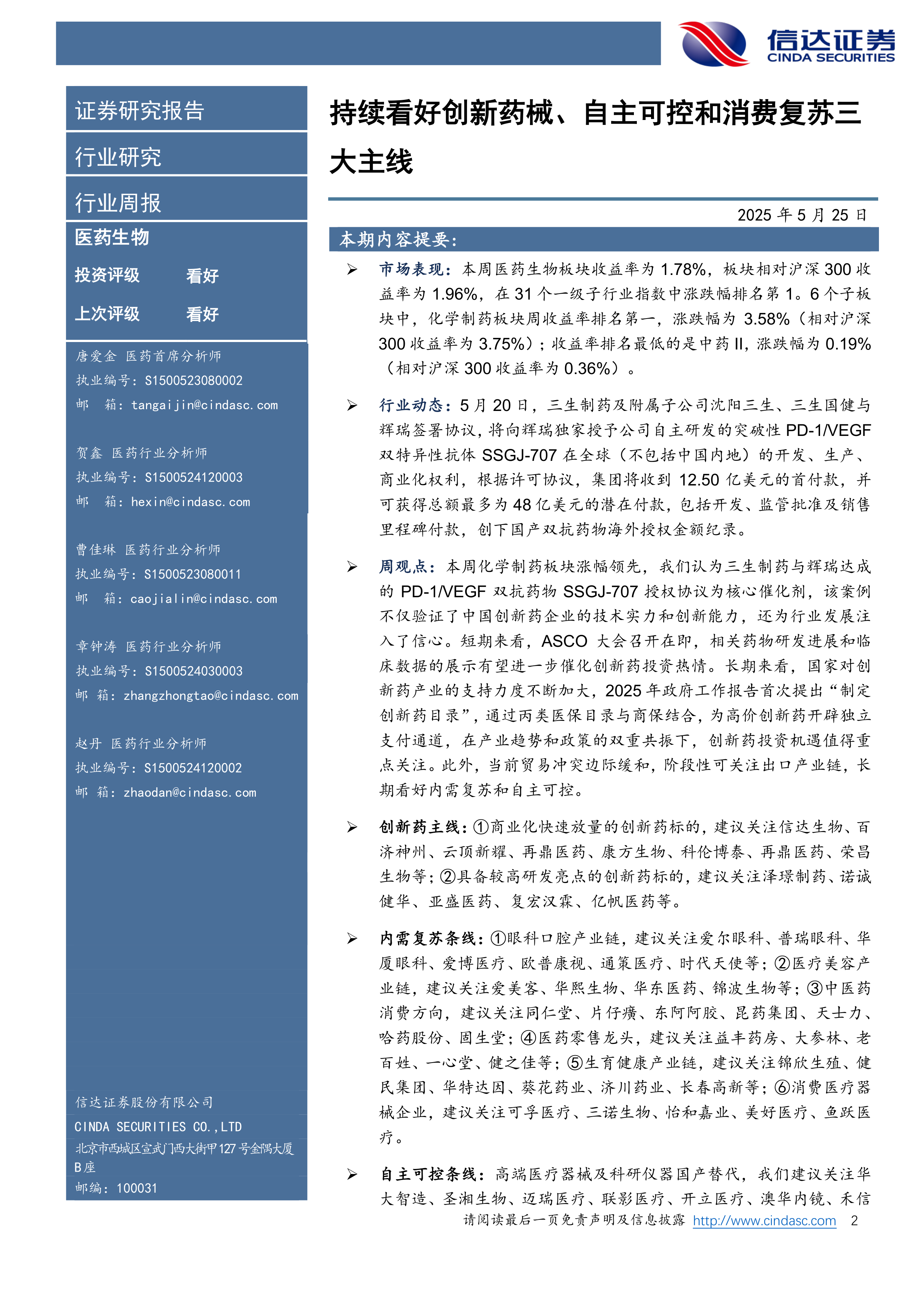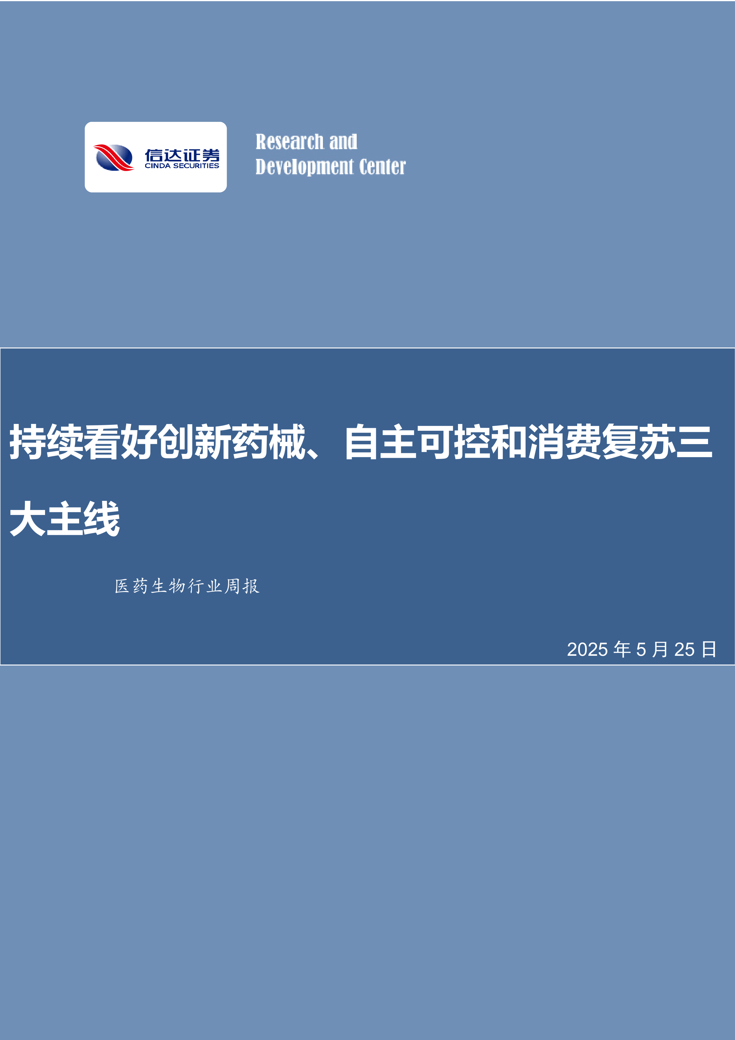 本报告的核心观点是持续看好创新药械、自主可控和消费复苏三大主线。基于2025年5月25日一周的市场表现和行业动态,报告从宏观市场表现、行业动态、投资策略三个方面进行分析,得出以下结论: