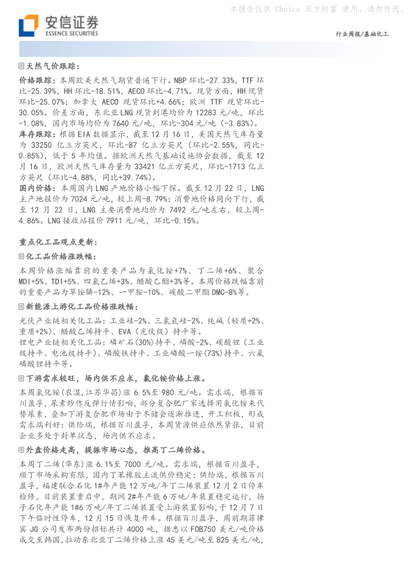 本报告对2022年12月25日一周的基础化工行业进行了全面分析。油价上涨是本周影响化工品市场的主要因素,导致部分化工产品价格上涨。然而,整体化工品价格指数下跌,天然气价格也普遍下行,市场表现分化。报告建议投资者关注油价波动、宏观经济环境以及地缘政治风险对化工品市场的影响,并根据自身风险承受能力进行投资决策。 报告推荐的投资标的集中在具有产业链一体化优势和核心竞争力的企业,以及在特定细分领域具有领先地位的企业。 投资者需注意报告中提到的风险提示,例如原料价格波动和下游需求不及预期等。
