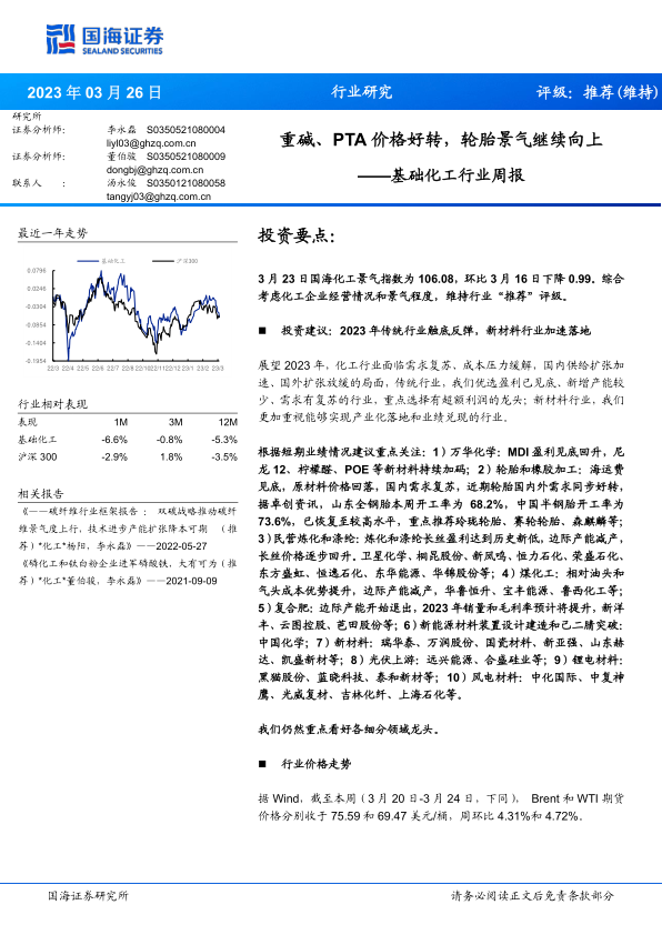 基础化工行业周报:重碱、PTA价格好转,轮胎景气继续向上