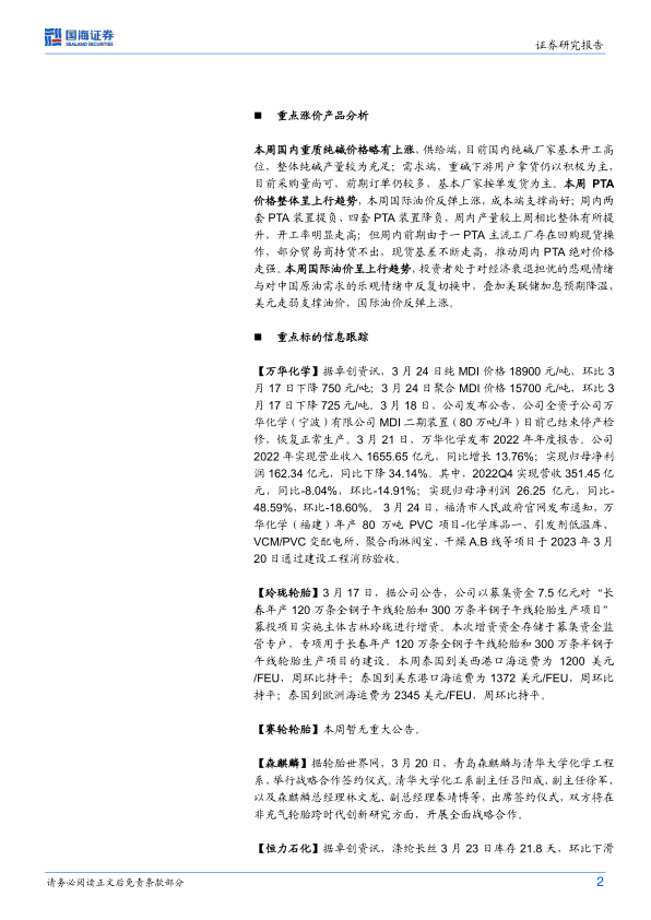 报告对万华化学、玲珑轮胎、赛轮轮胎、森麒麟、恒力石化、荣盛石化、东方盛虹、恒逸石化、卫星化学、桐昆股份、新凤鸣、新洋丰、齐翔腾达、云图控股、中国化学、龙佰集团、阳谷华泰、双箭股份、华峰化学、新和成、三友化工、华鲁恒升、宝丰能源、瑞华泰、国瓷材料、华峰化学、新和成、三友化工、华鲁恒升、宝丰能源、金禾实业、扬农化工、利尔化学、国光股份、长青股份、海利尔、三棵树、金发科技、道恩股份、万润股份、利安隆、山东赫达、新亚强、凯盛新材、粤桂股份、中化国际、楚江新材、齐翔腾达、蓝晓科技、盐湖股份等多家公司进行了详细的业绩跟踪和市场表现分析,内容包括公司公告、产品价格波动、库存变化、产能扩张计划等方面的信息。 分析涵盖了MDI、PTA、涤纶长丝、轮胎、纯碱、磷酸一铵、复合肥、维生素、丙烯酸、草甘膦等多种化工产品的价格走势及市场供需情况。