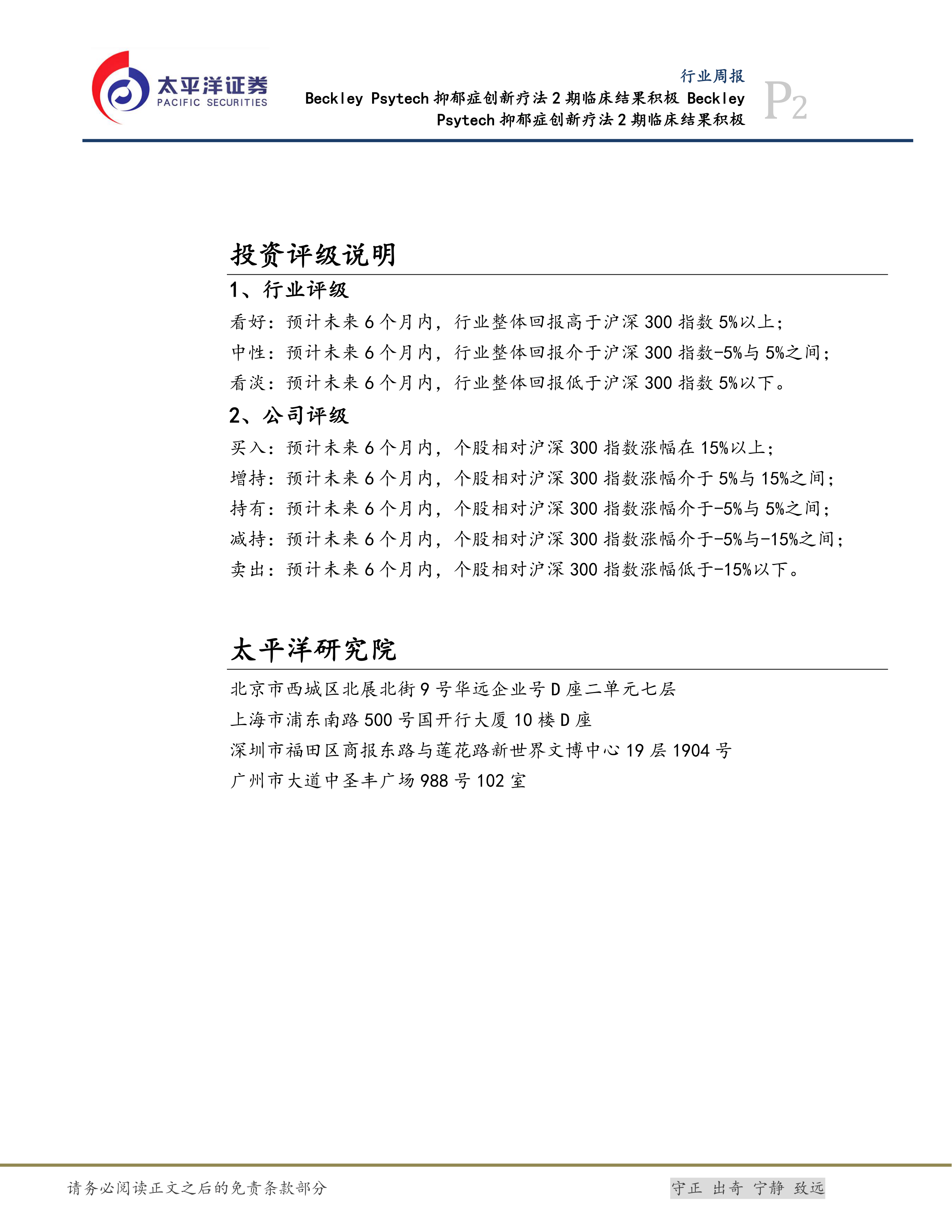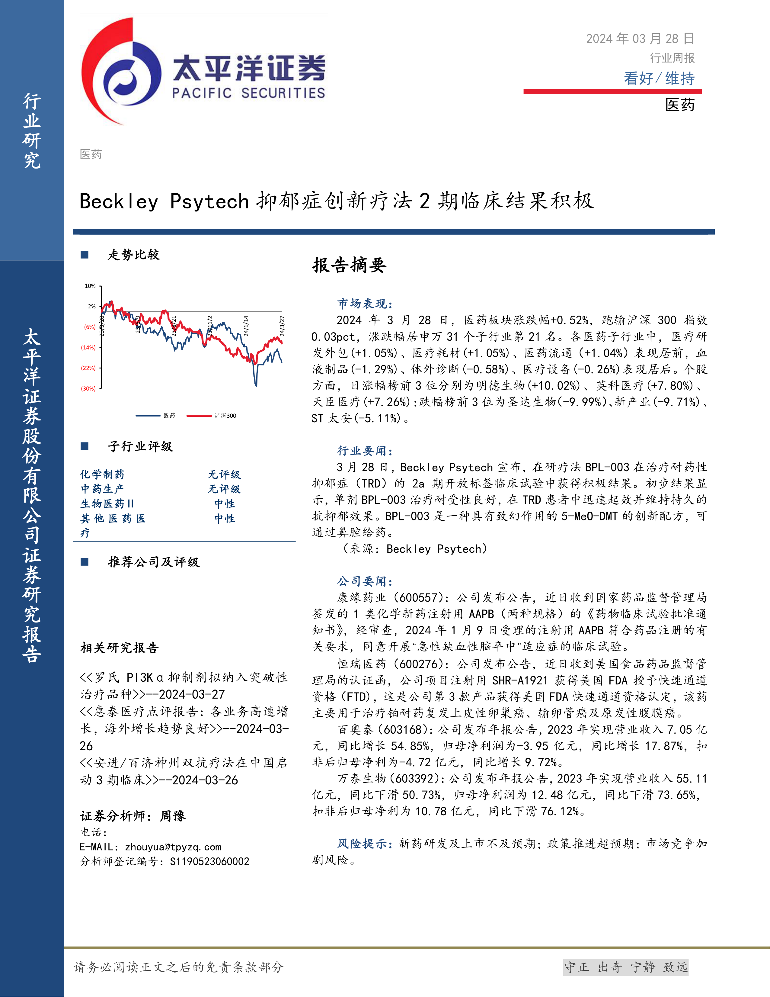 医药行业周报:Beckley Psytech抑郁症创新疗法2期临床结果积极