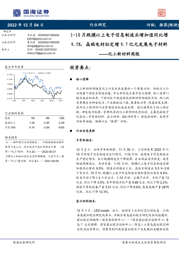 化工新材料领域是化工行业未来发展的一个重要方向,传统化工行业随着下游需求增速放缓,市占率向龙头集中是大趋势,核心竞争门槛为成本和效率;下游仍处于快速增长的新材料领域则不同,核心的竞争壁垒为研发能力、产业链验证门槛、服务能力等,随着政策支持,国内化工新材料行业有望迎来加速成长期。我们推荐处于核心供应链、研发能力较强、管理优异的化工新材料优质标的,主要包括电子化学品(半导体材料、显示材料、5G材料等)、新能源材料、医药中间体等领域。维持行业“推荐”评级。