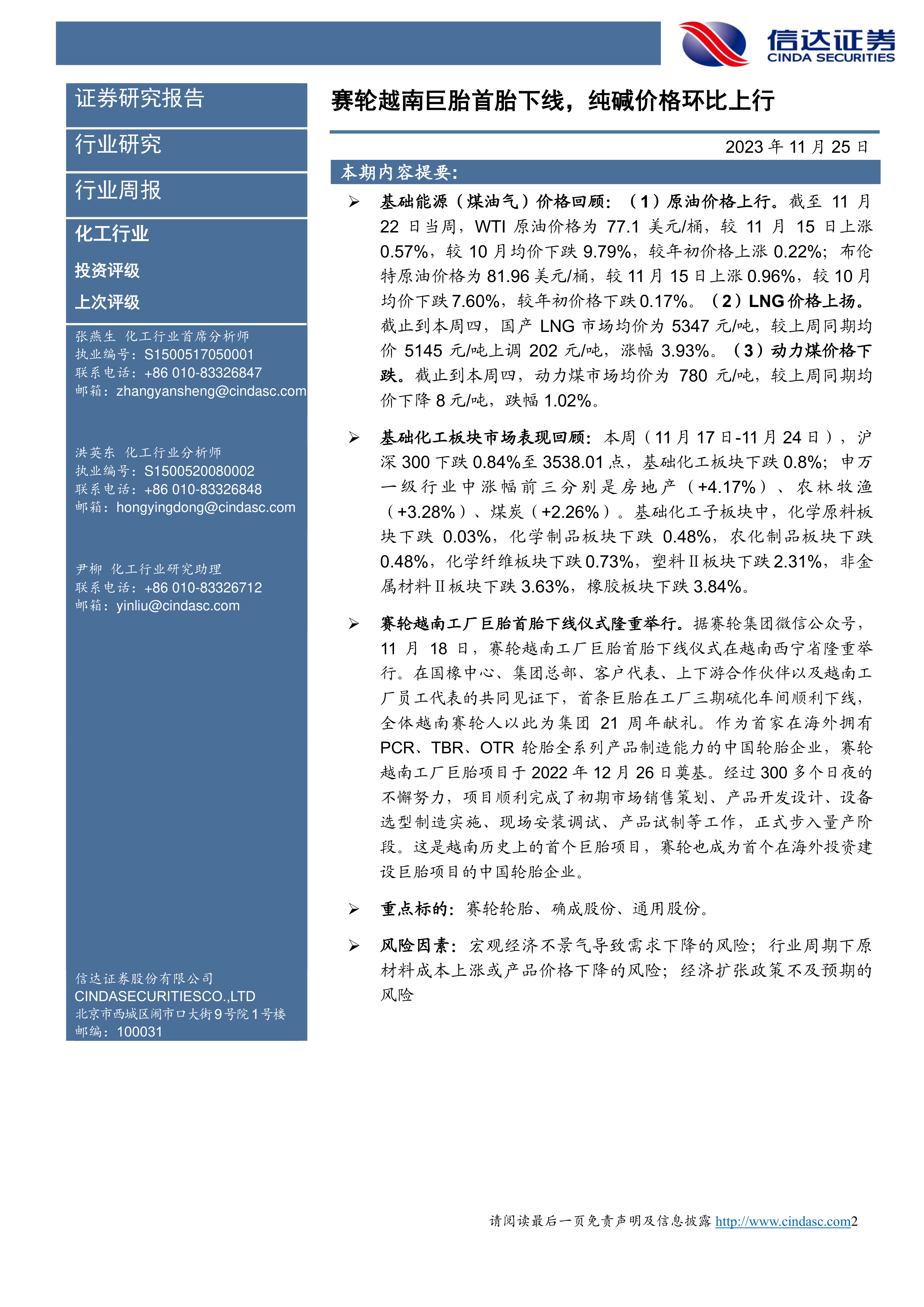 化工行业周报:赛轮越南巨胎首胎下线,纯碱价格环比上行