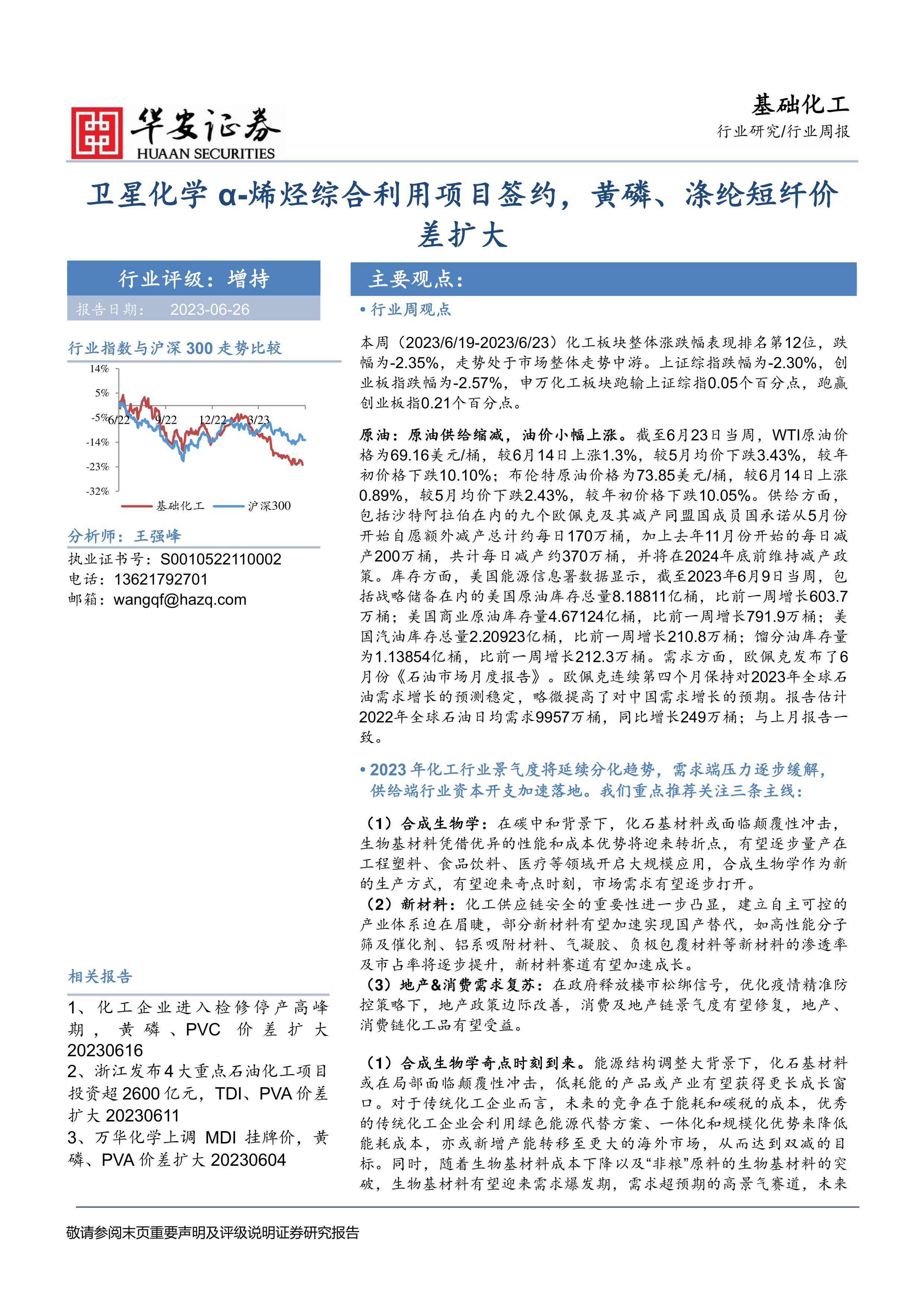 基础化工行业周报:卫星化学α-烯烃综合利用项目签约,黄磷、涤纶短纤价差扩大
