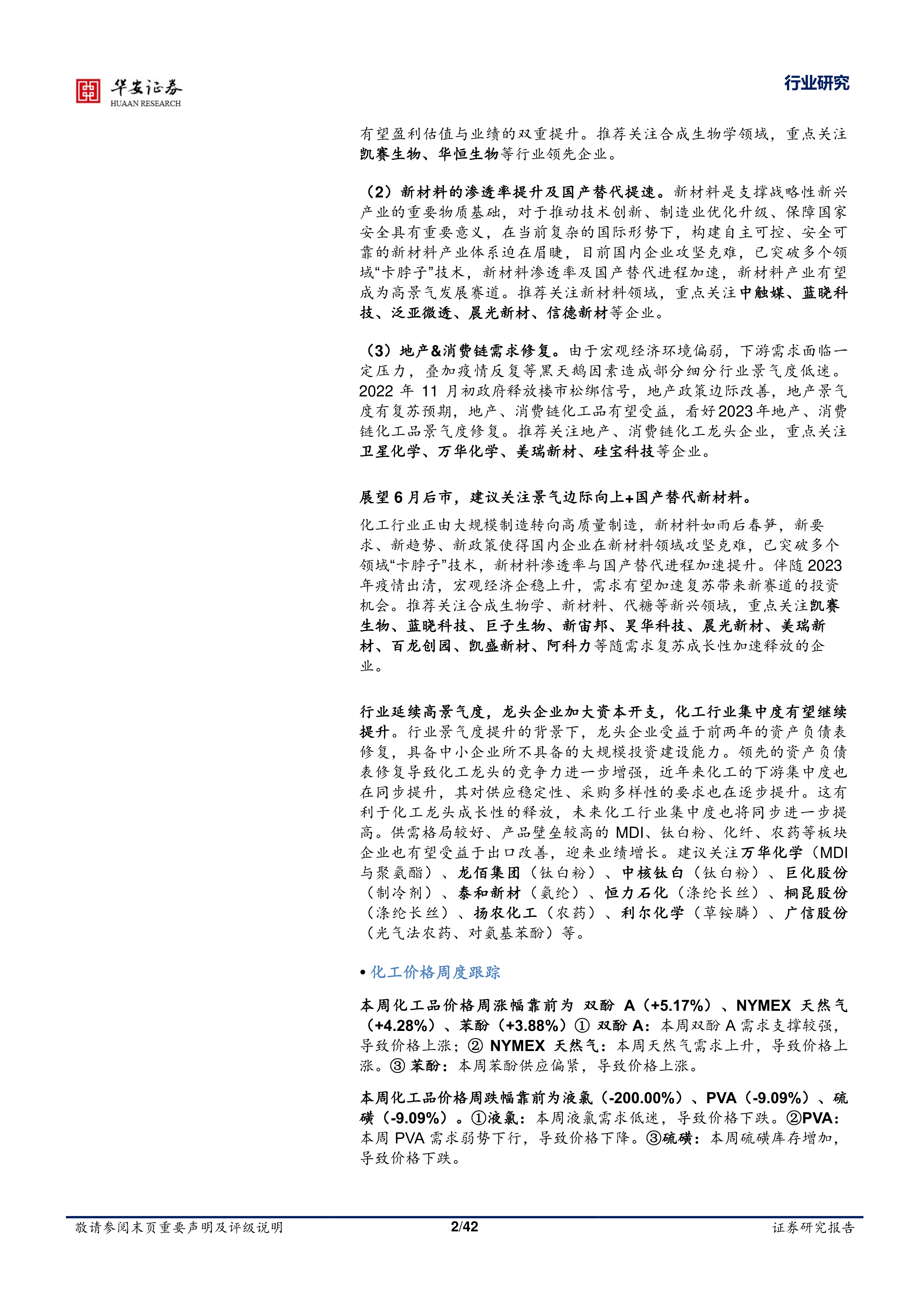 化工行业正由大规模制造转向高质量制造,新材料如雨后春笋,新要求、新趋势、新政策使得国内企业在新材料领域攻坚克难,已突破多个领域“卡脖子”技术,新材料渗透率与国产替代进程加速提升。伴随2023年疫情出清,宏观经济企稳上升,需求有望加速复苏带来新赛道的投资机会。推荐关注合成生物学、新材料、代糖等新兴领域,重点关注凯赛生物、蓝晓科技、巨子生物、新宙邦、昊华科技、晨光新材、美瑞新材、百龙创园、凯盛新材、阿科力等随需求复苏成长性加速释放的企业。