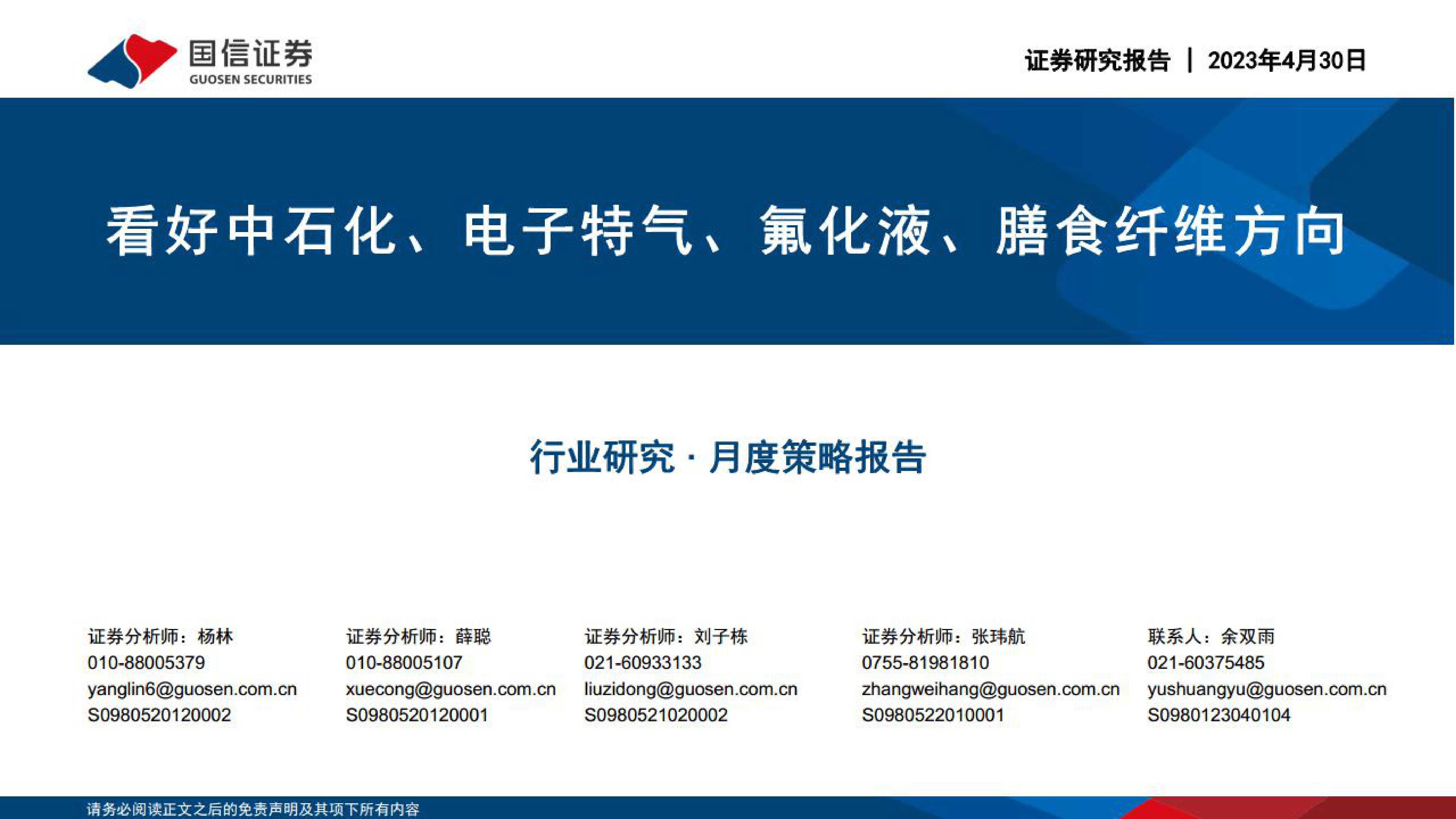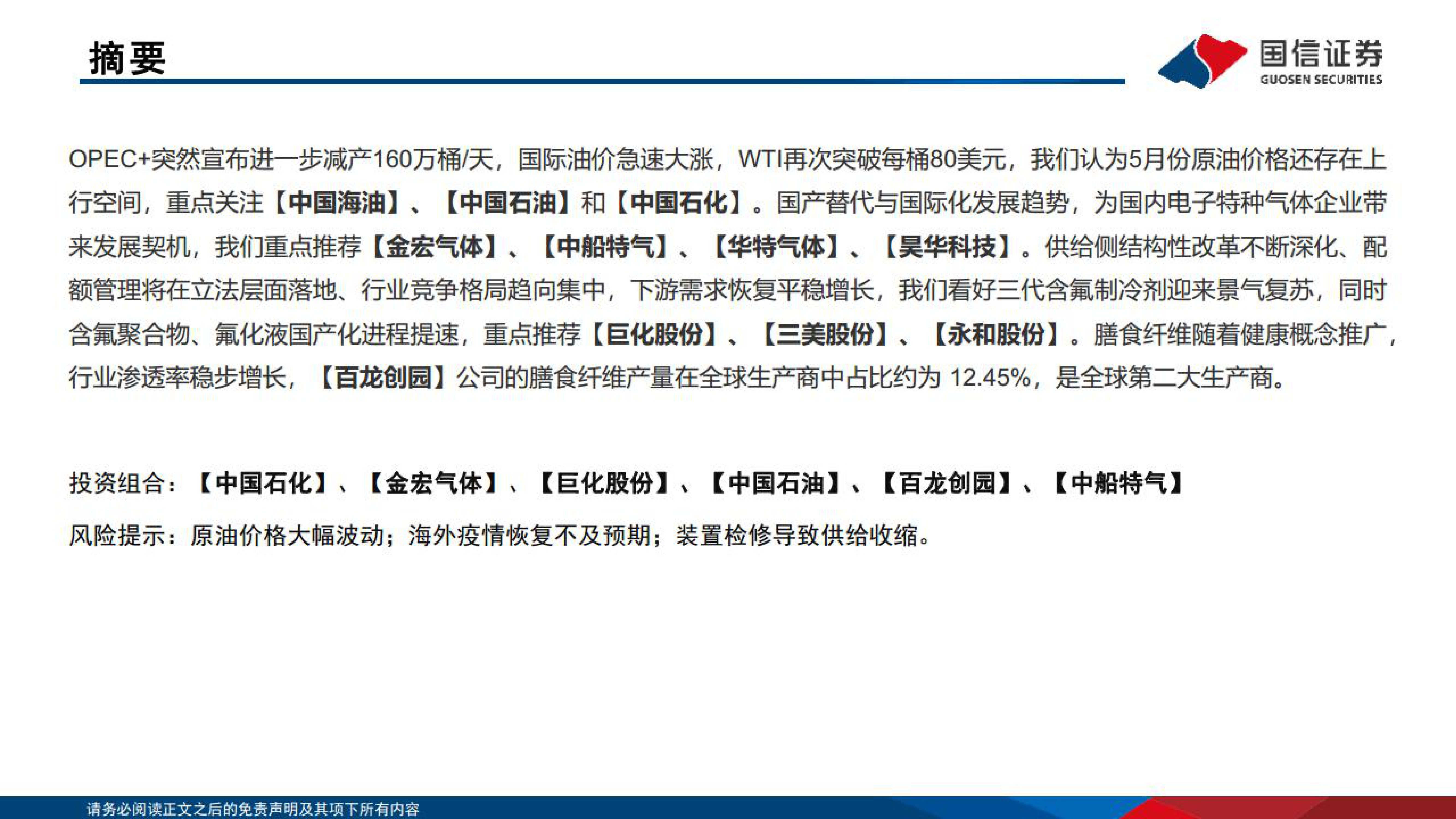 OPEC+突然宣布进一步减产160万桶/天,国际油价急速大涨,WTI再次突破每桶80美元,我们认为5月份原油价格还存在上行空间,重点关注【中国海油】、【中国石油】和【中国石化】。国产替代与国际化发展超势,为国内电子特种气体企业带来发展契机,我们重点推荐【金宏气体】、【中船特气】、【华特气体】、【昊华科技】。供给侧结构性改革不断深化、配额管理将在立法层面落地、行业竞争格局超向集中,下游需求恢复平稳增长,我们看好三代含氧制冷剂迎来景气复苏,同时含氟聚合物、氟化液国产化进程提速,重点推荐【巨化股份】、【三美股份】、【永和股份】。腾食纤维随着健康概念推广行业渗透率稳步增长,【百龙创园】公司的膳食纤维产量在全球生产商中占比约为12.45%,是全球第二大生产商