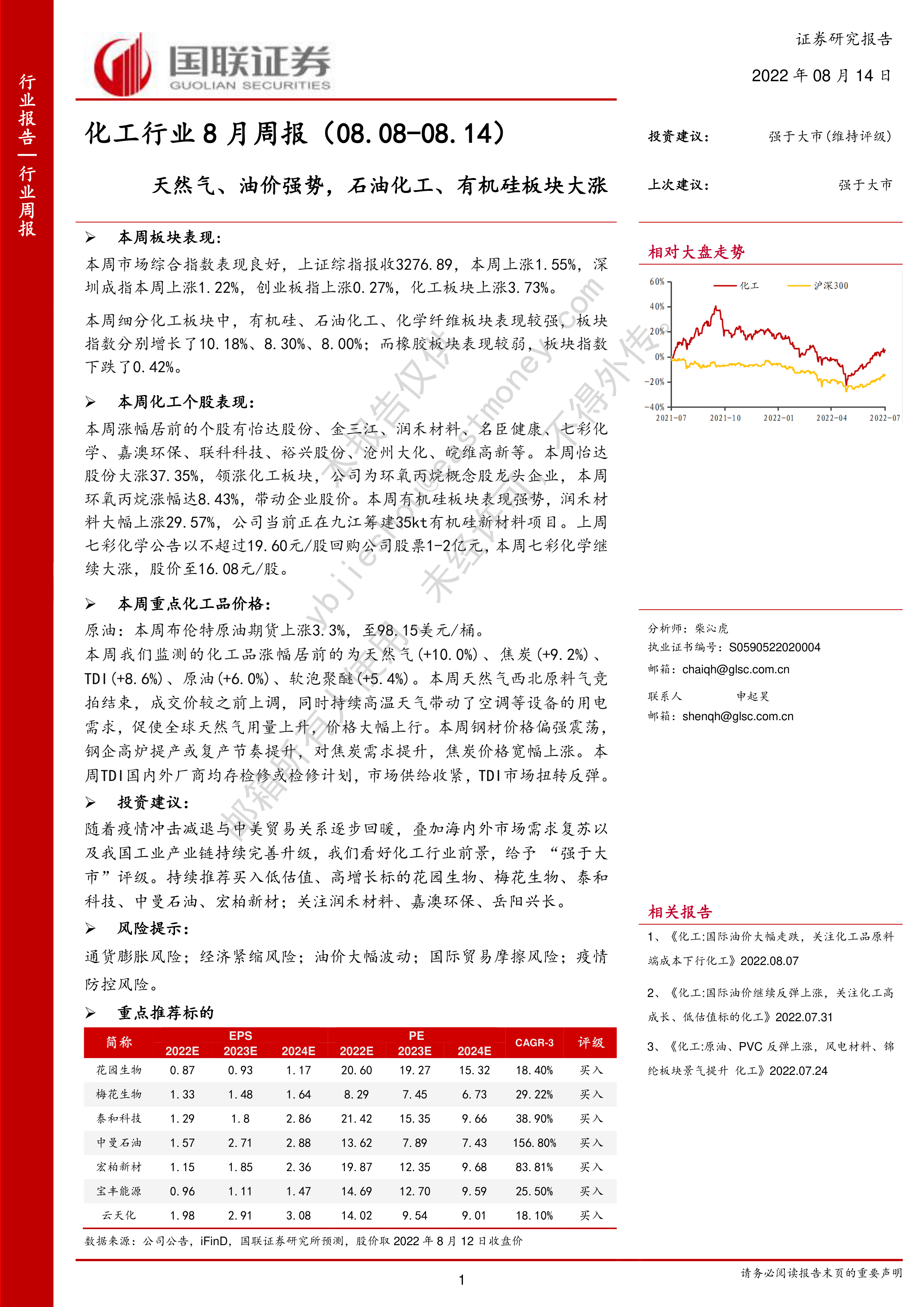 化工行业8月周报:天然气、油价强势,石油化工、有机硅板块大涨