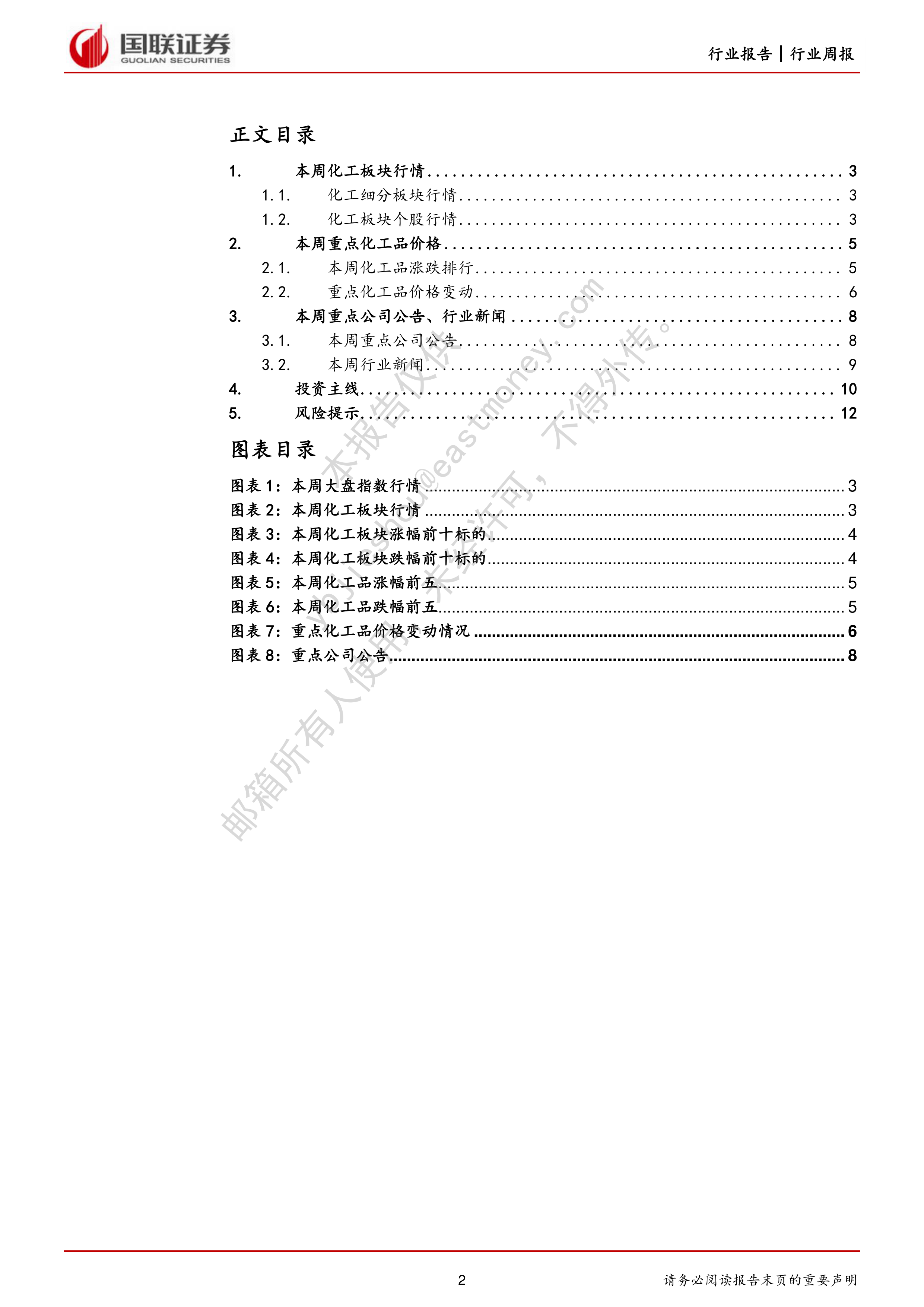 本报告的核心观点是:化工行业整体向好,但面临诸多风险。 本周化工板块表现强劲,主要受天然气、油价上涨以及部分化工品供给收紧的影响。有机硅、石油化工、化学纤维板块涨幅显著,而橡胶板块表现相对较弱。部分个股涨幅较大,主要原因是公司基本面良好或受市场情绪影响。然而,报告也指出了通货膨胀、经济紧缩、油价波动、国际贸易摩擦以及疫情防控等风险因素,需要投资者谨慎关注。