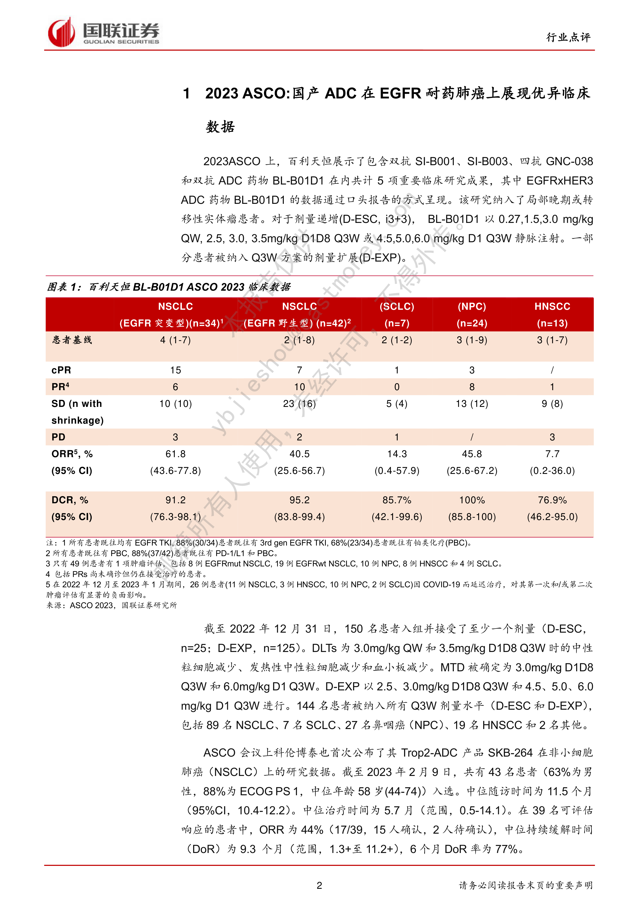 本报告的核心观点是:2023年ASCO会议上,国产ADC药物在EGFR耐药肺癌治疗领域展现出优异的临床数据,尤其百利天恒的BL-B01D1和科伦博泰的SKB-264表现突出,具备成为同类药物中“Best-in-Class”的潜力,但同时也需关注临床试验结果不及预期、商业化合作进度不及预期以及市场竞争加剧等风险。