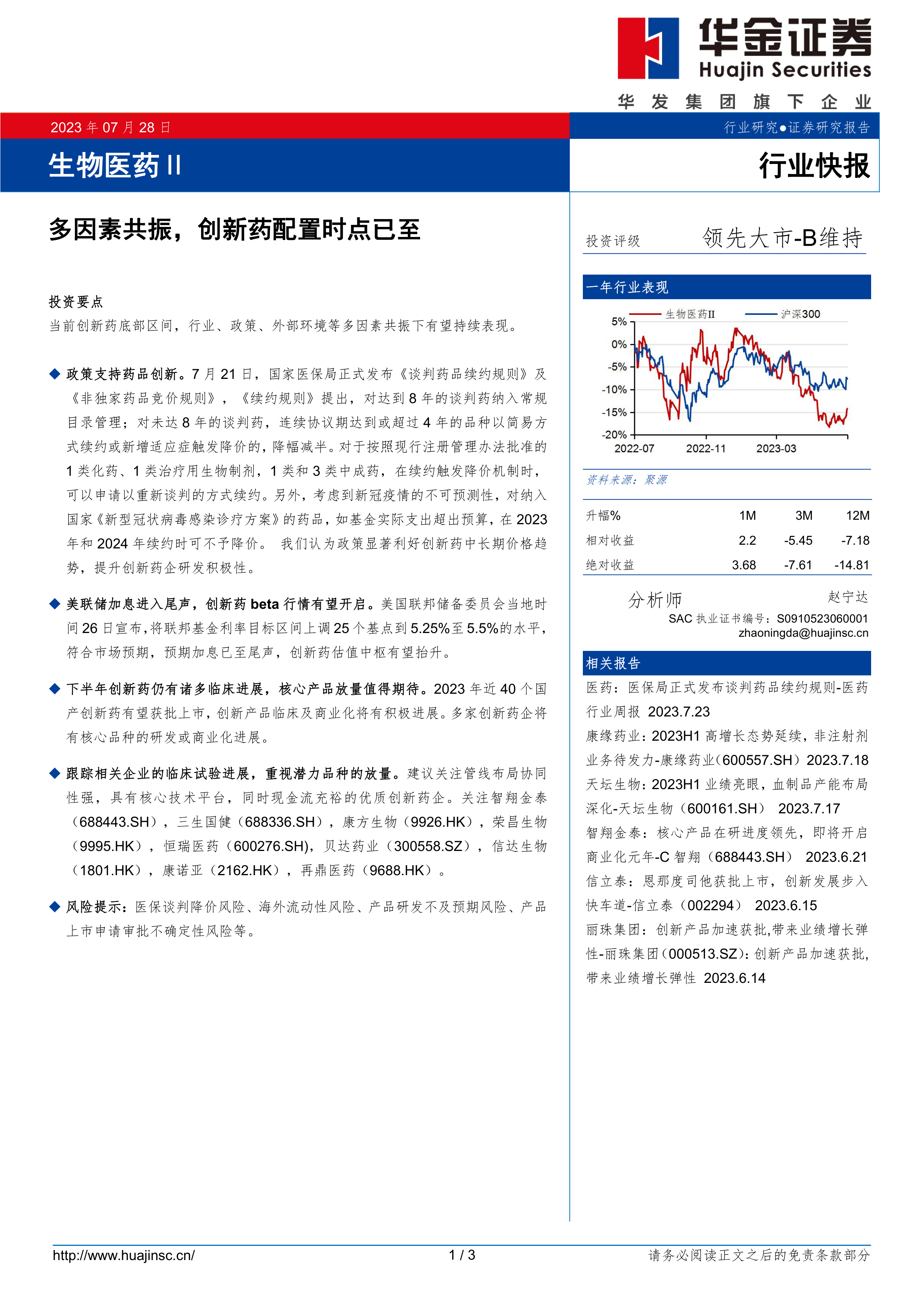 报告还简要介绍了华金证券近期发布的其他相关研究报告,例如:《医药:医保局正式发布谈判药品续约规则-医药行业周报 2023.7.23》、《康缘药业:2023H1高增长态势延续,非注射剂业务待发力-康缘药业(600557.SH)2023.7.18》、《天坛生物:2023H1业绩亮眼,血制品产能布局深化-天坛生物(600161.SH) 2023.7.17》、《智翔金泰:核心产品在研进度领先,即将开启商业化元年-C智翔(688443.SH) 2023.6.21》、《信立泰:恩那度司他获批上市,创新发展步入快车道-信立泰(002294) 2023.6.15》、《丽珠集团:创新产品加速获批,带来业绩增长弹性-丽珠集团(000513.SZ):创新产品加速获批, 带来业绩增长弹性 2023.6.14》。这些报告从不同角度对医药行业及相关上市公司进行了深入分析。