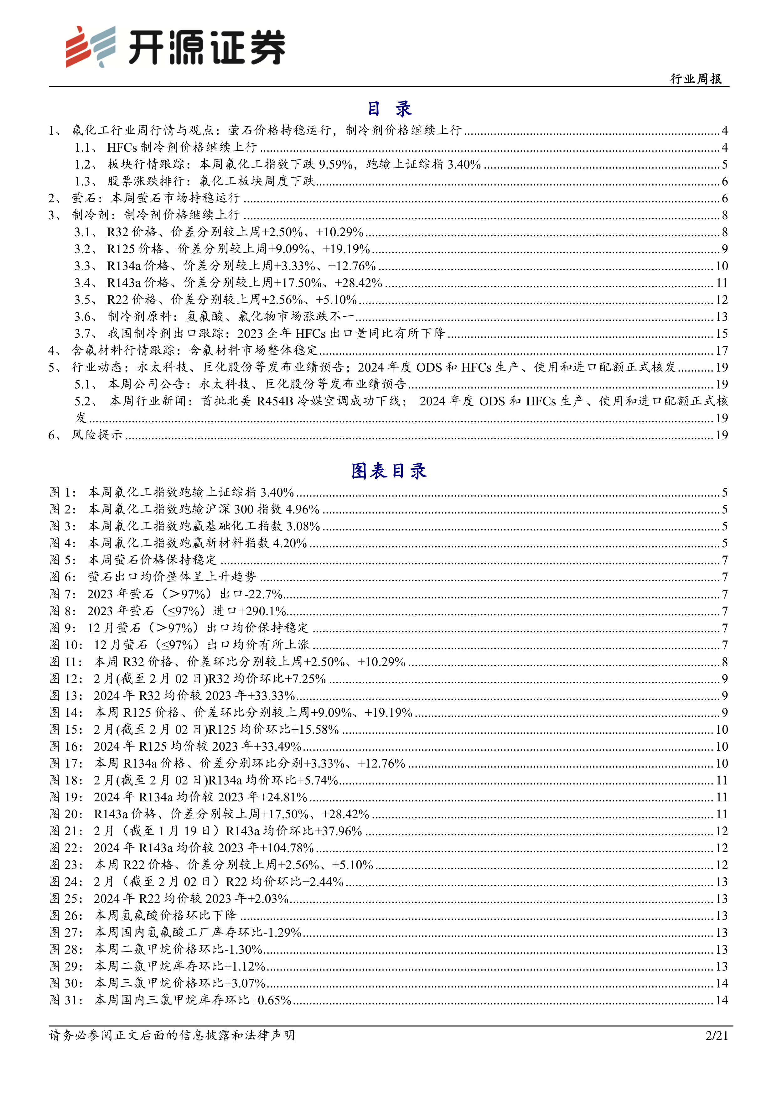 本报告的核心观点是:氟化工行业,特别是制冷剂市场,在2024年将持续向好,呈现长景气周期。萤石价格虽然本周持平,但同比上涨,长期来看仍有上涨潜力。HFCs配额的下发进一步推动了制冷剂价格的上涨,相关企业有望受益。然而,下游需求不及预期、价格波动、政策变化和安全生产等风险依然存在。