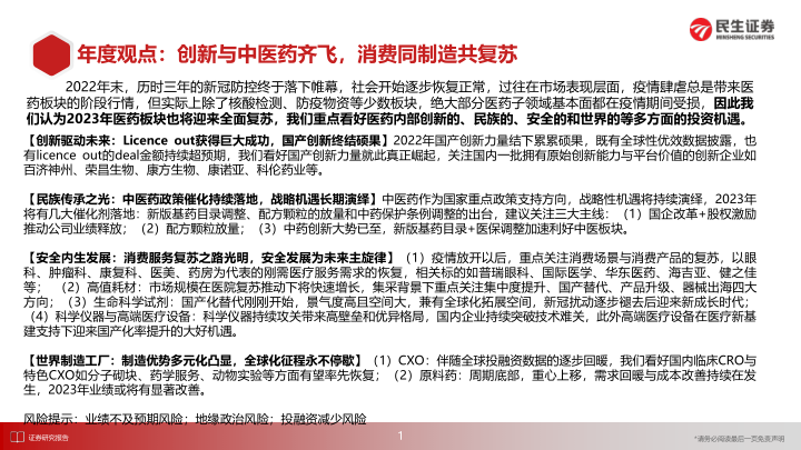 2022年末,历时三年的新冠防控终于落下帷幕,社会开始逐步恢复正常,过往在市场表现层面,疫情肆虐总是带来医药板块的阶段行情,但实际上除了核酸检测、防疫物资等少数板块,绝大部分医药子领域基本面都在疫情期间受损,因此我们认为2023年医药板块也将迎来全面复苏,我们重点看好医药内部创新的、民族的、安全的和世界的等多方面的投资机遇。