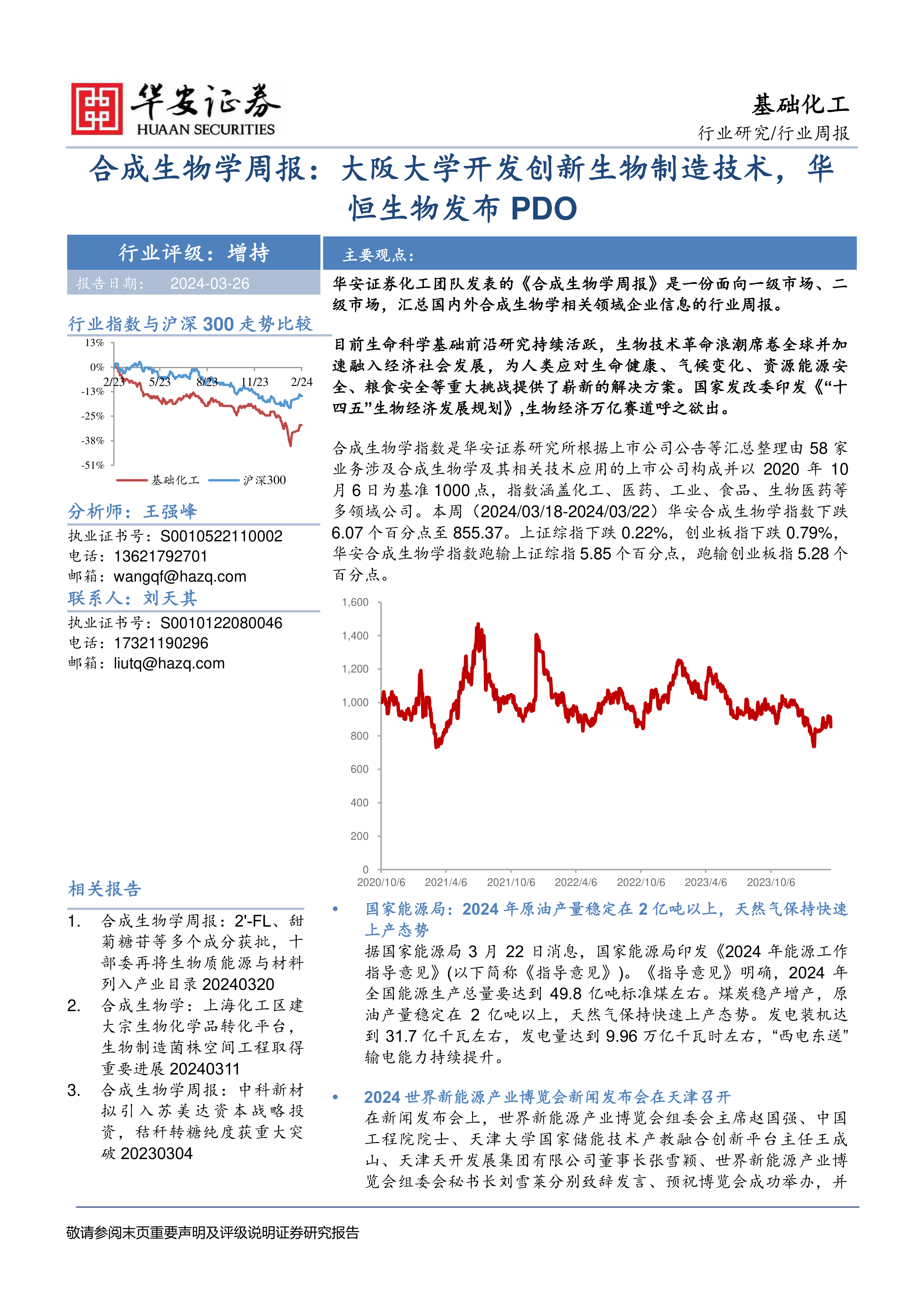 本周(2024年3月18日至22日)华安合成生物学指数下跌6.07%,跑输上证综指和创业板指,行业内个股表现分化,部分公司涨幅显著,部分公司跌幅明显。尽管短期市场表现波动,但长期来看,合成生物学行业仍具有巨大的发展潜力,市场规模有望持续扩大。