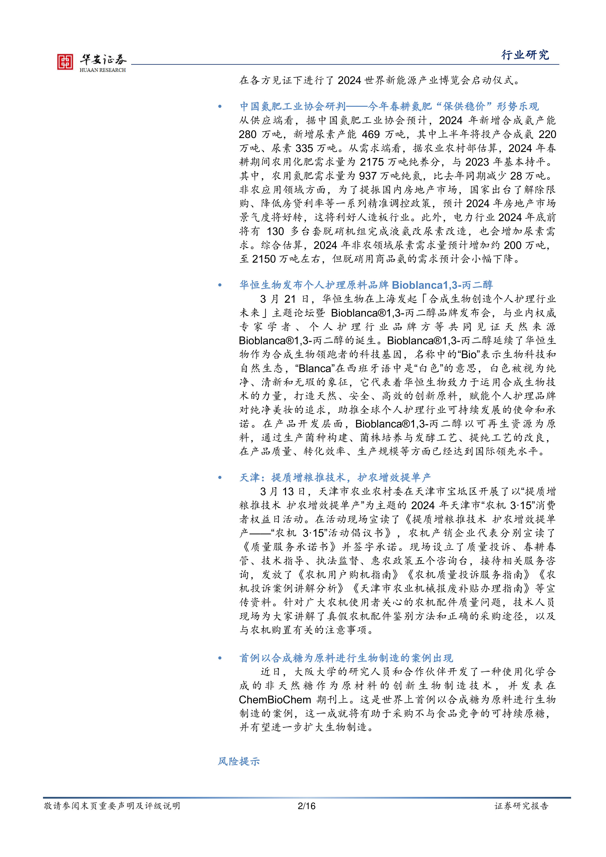 从供应端看,据中国氮肥工业协会预计,2024年新增合成氨产能280万吨,新增尿素产能469万吨,其中上半年将投产合成氨220万吨、尿素335万吨。从需求端看,据农业农村部估算,2024年春耕期间农用化肥需求量为2175万吨纯养分,与2023年基本持平。其中,农用氮肥需求量为937万吨纯氮,比去年同期减少28万吨。非农应用领域方面,为了提振国内房地产市场,国家出台了解除限购、降低房贷利率等一系列精准调控政策,预计2024年房地产市场景气度将好转,这将利好人造板行业。此外,电力行业2024年底前将有130多台套脱硝机组完成液氨改尿素改造,也会增加尿素需求。综合估算,2024年非农领域尿素需求量预计增加约200万吨,至2150万吨左右,但脱硝用商品氨的需求预计会小幅下降。