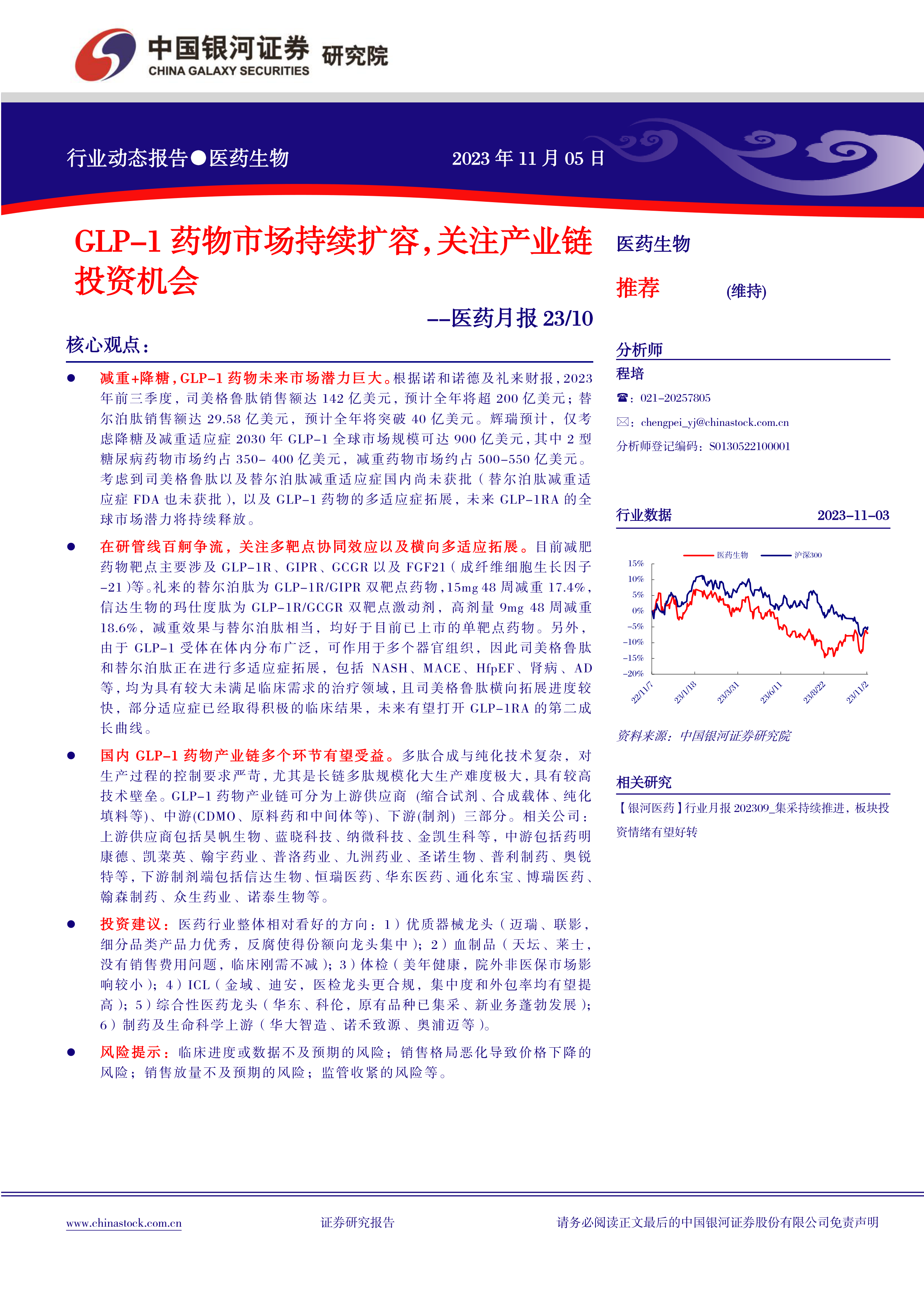 医药月报23/10:GLP-1药物市场持续扩容,关注产业链投资机会