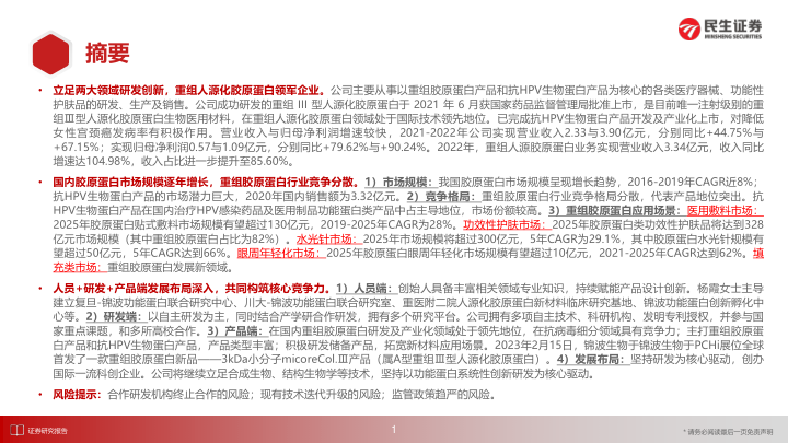 立足两大领域研发创新,重组人源化胶原蛋白领军企业。公司主要从事以重组胶原蛋白产品和抗HPV生物蛋白产品为核心的各类医疗器械、功能性护肤品的研发、生产及销售。公司成功研发的重组III型人源化胶原蛋白于2021年6月获国家药品监督管理局批准上市,是目前唯一注射级别的重组Ⅲ型人源化胶原蛋白生物医用材料,在重组人源化胶原蛋白领域处于国际技术领先地位。已完成抗HPV生物蛋白产品开发及产业化上市,对降低女性宫颈癌发病率有积极作用。营业收入与归母净利润增速较快,2021-2022年公司实现营业收入2.33与3.90亿元,分别同比+44.75%与+67.15%;实现归母净利润0.57与1.09亿元,分别同比+79.62%与+90.24%。2022年,重组人源胶原蛋白业务实现营业收入3.34亿元,收入同比增速达104.98%,收入占比进一步提升至85.60%。