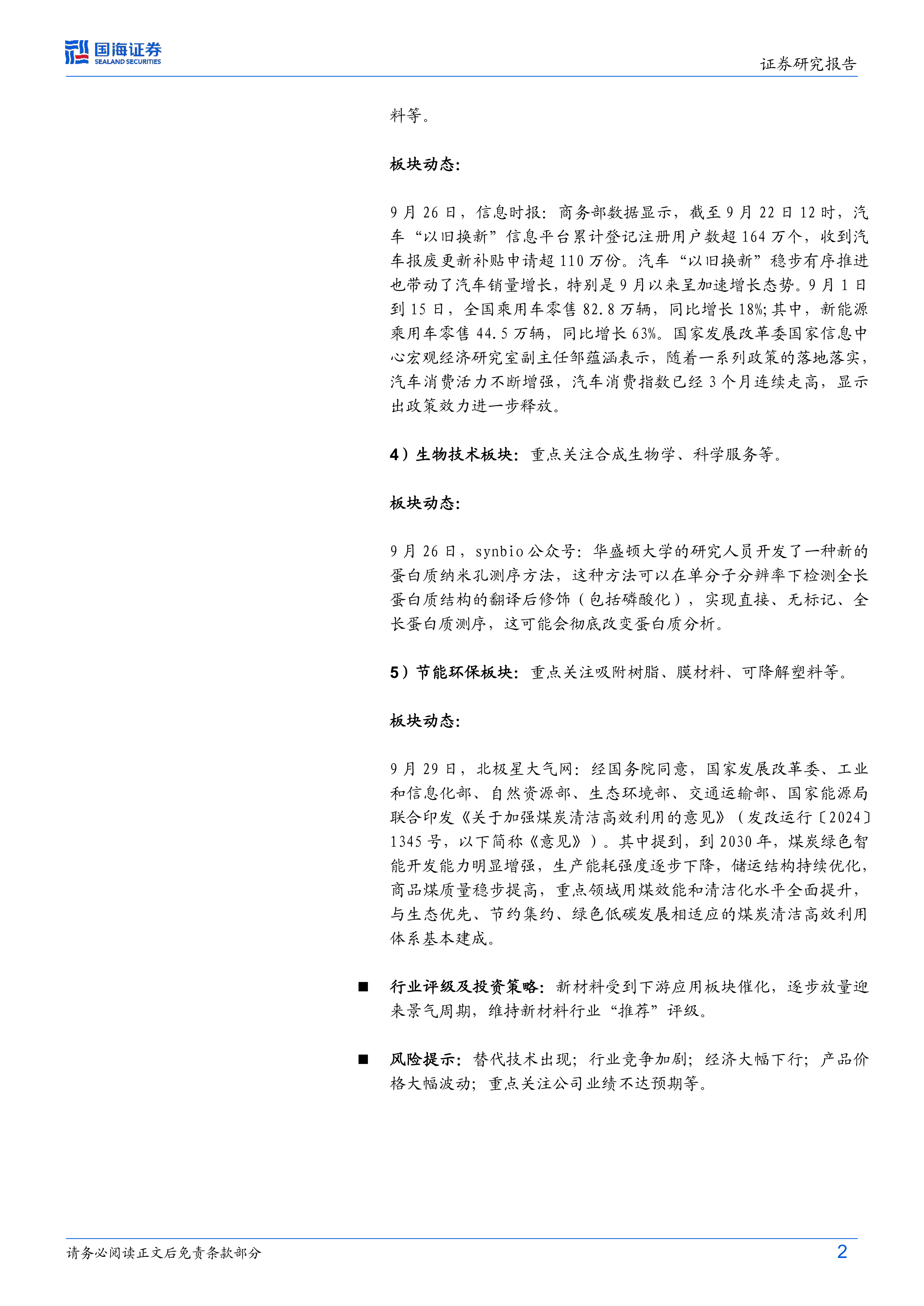 本报告详细分析了新材料行业,并对重点关注的几个板块进行了深入研究,包括电子信息、航空航天、新能源、生物技术和节能环保板块。