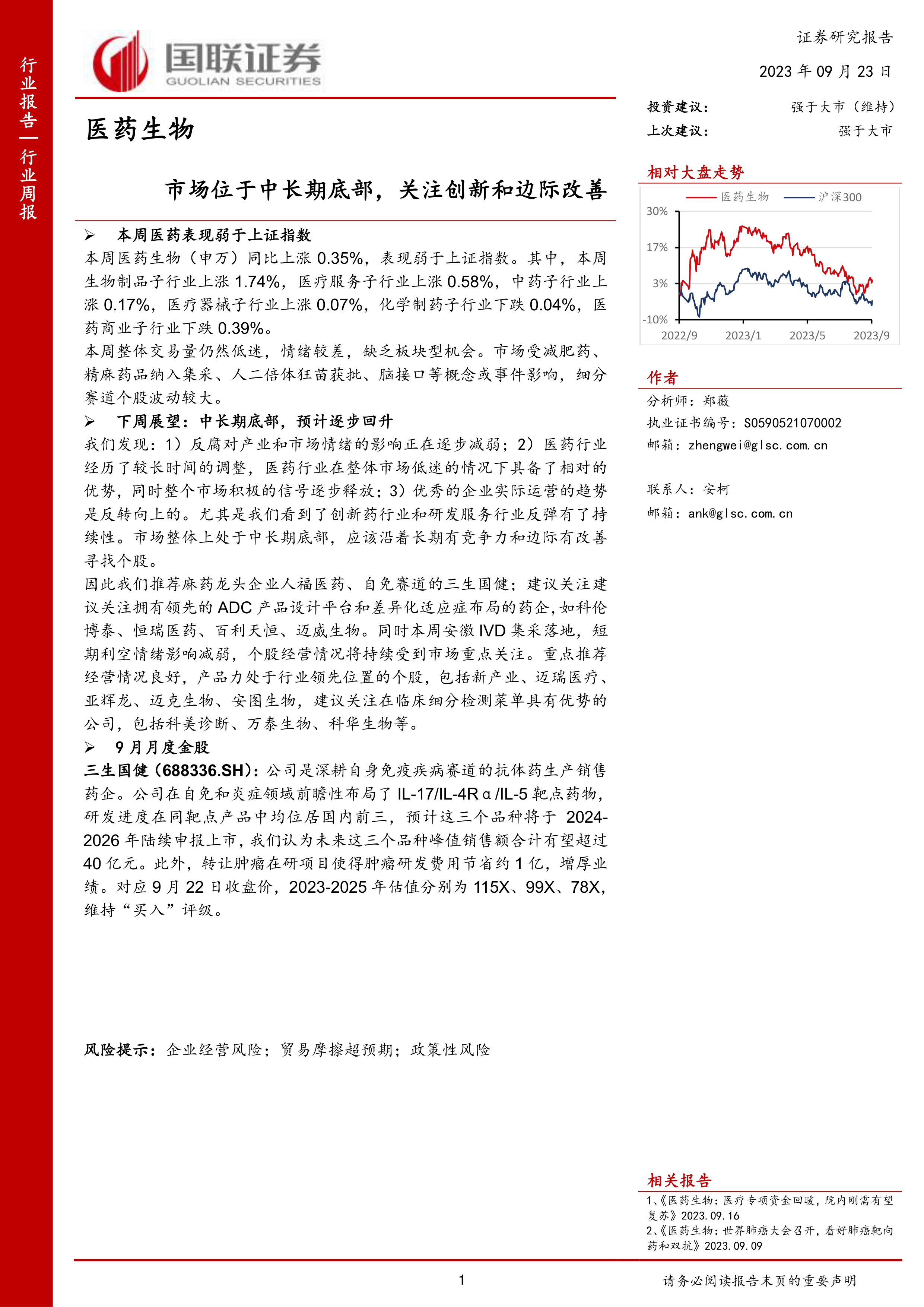 三生国健(688336.SH):公司是深耕自身免疫疾病赛道的抗体药生产销售药企。公司在自免和炎症领域前瞻性布局了IL-17/IL-4Rα/IL-5靶点药物,研发进度在同靶点产品中均位居国内前三,预计这三个品种将于2024-2026年陆续申报上市,我们认为未来这三个品种峰值销售额合计有望超过40亿元。此外,转让肿瘤在研项目使得肿瘤研发费用节省约1亿,增厚业绩。对应9月22日收盘价,2023-2025年估值分别为115X、99X、78X,维持“买入”评级。