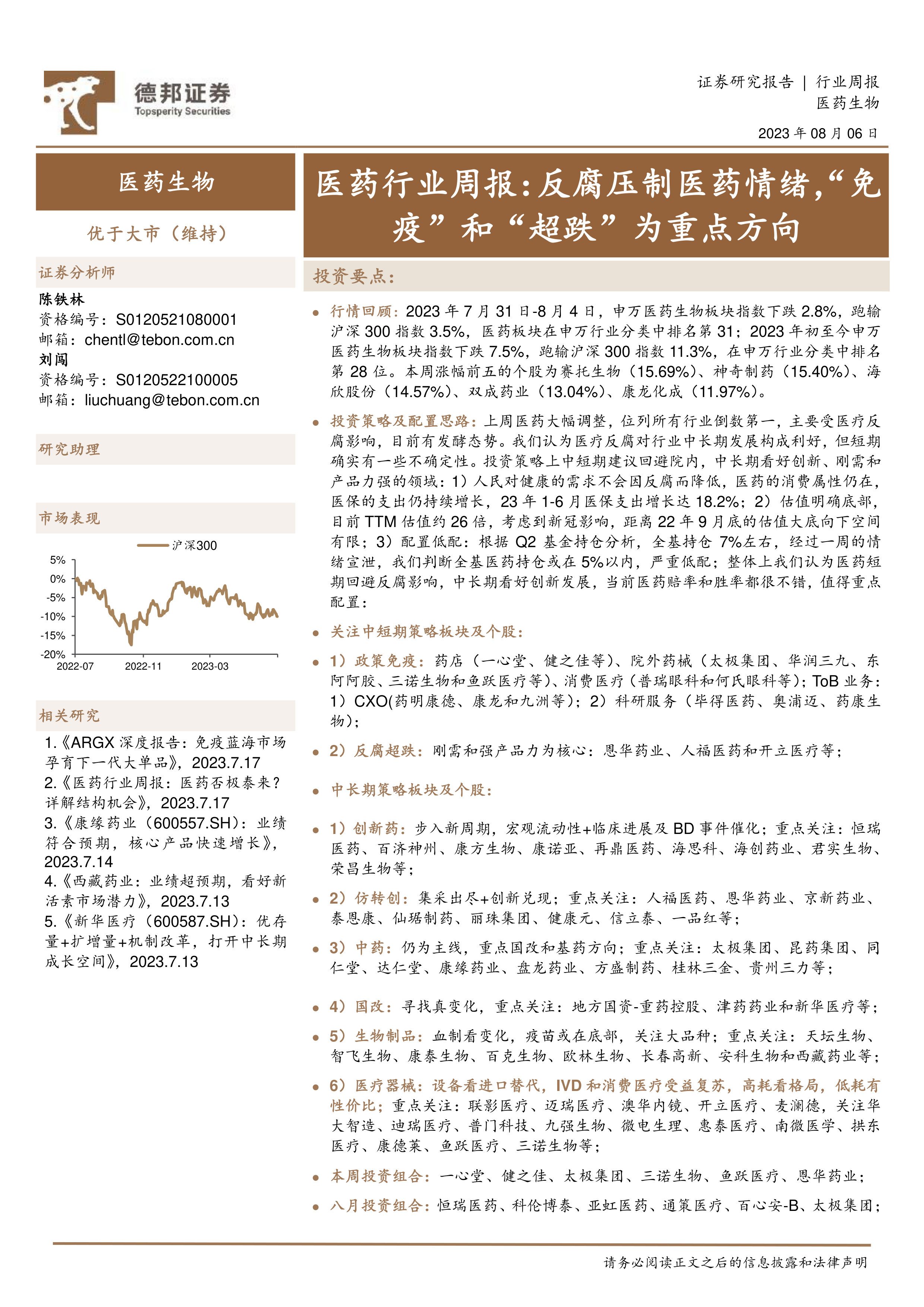 投资策略及配置思路:上周医药大幅调整,位列所有行业倒数第一,主要受医疗反腐影响,目前有发酵态势。我们认为医疗反腐对行业中长期发展构成利好,但短期确实有一些不确定性。投资策略上中短期建议回避院内,中长期看好创新、刚需和产品力强的领域:1)人民对健康的需求不会因反腐而降低,医药的消费属性仍在,医保的支出仍持续增长,23年1-6月医保支出增长达18.2%;2)估值明确底部,目前TTM估值约26倍,考虑到新冠影响,距离22年9月底的估值大底向下空间有限;3)配置低配:根据Q2基金持仓分析,全基持仓7%左右,经过一周的情绪宣泄,我们判断全基医药持仓或在5%以内,严重低配;整体上我们认为医药短期回避反腐影响,中长期看好创新发展,当前医药赔率和胜率都很不错,值得重点配置: