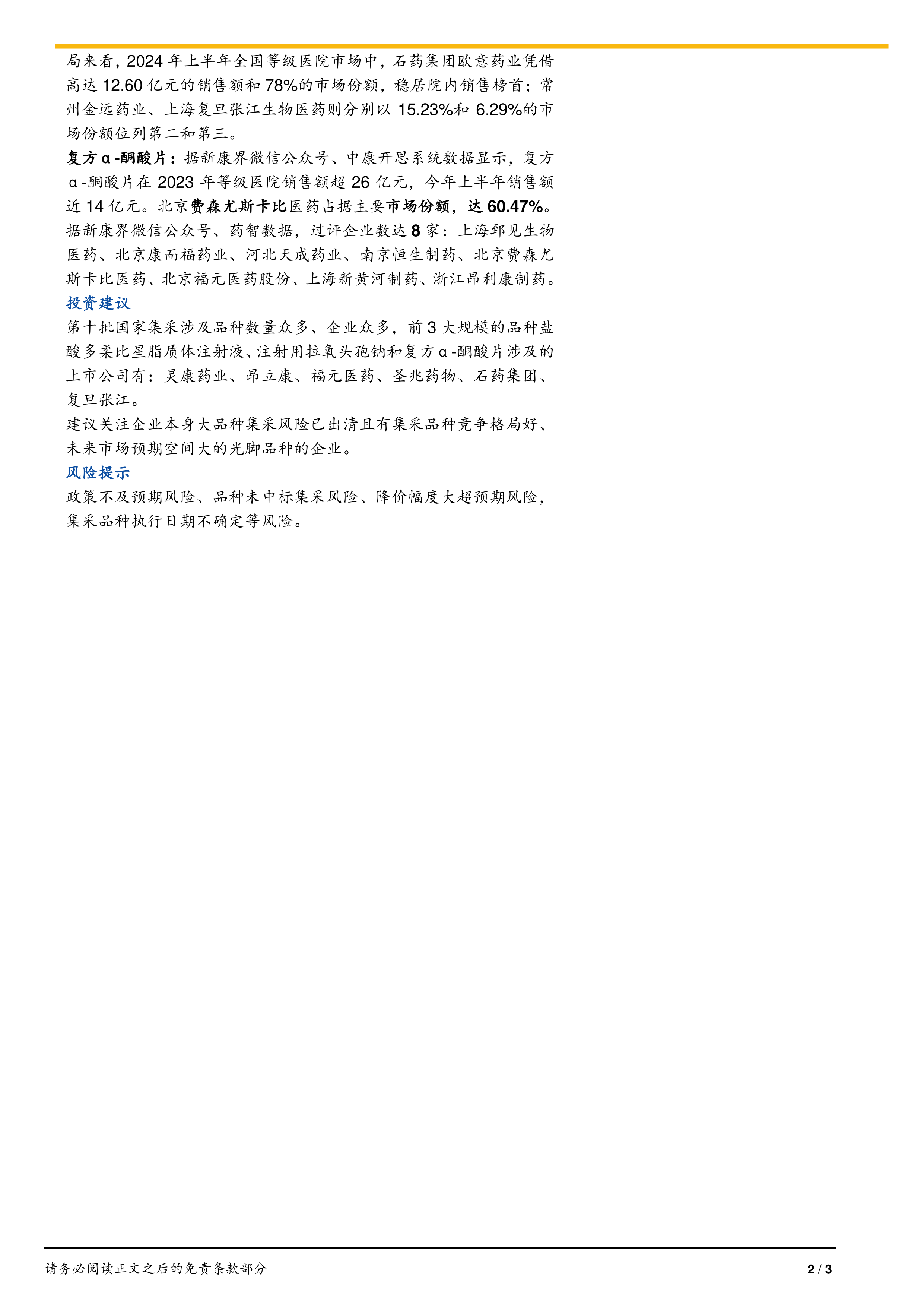 报告建议关注企业本身大品种集采风险已出清且有集采品种竞争格局好、未来市场预期空间大的光脚品种的企业。 涉及前三大品种的相关上市公司包括:灵康药业、昂立康、福元医药、圣兆药物、石药集团、复旦张江等。