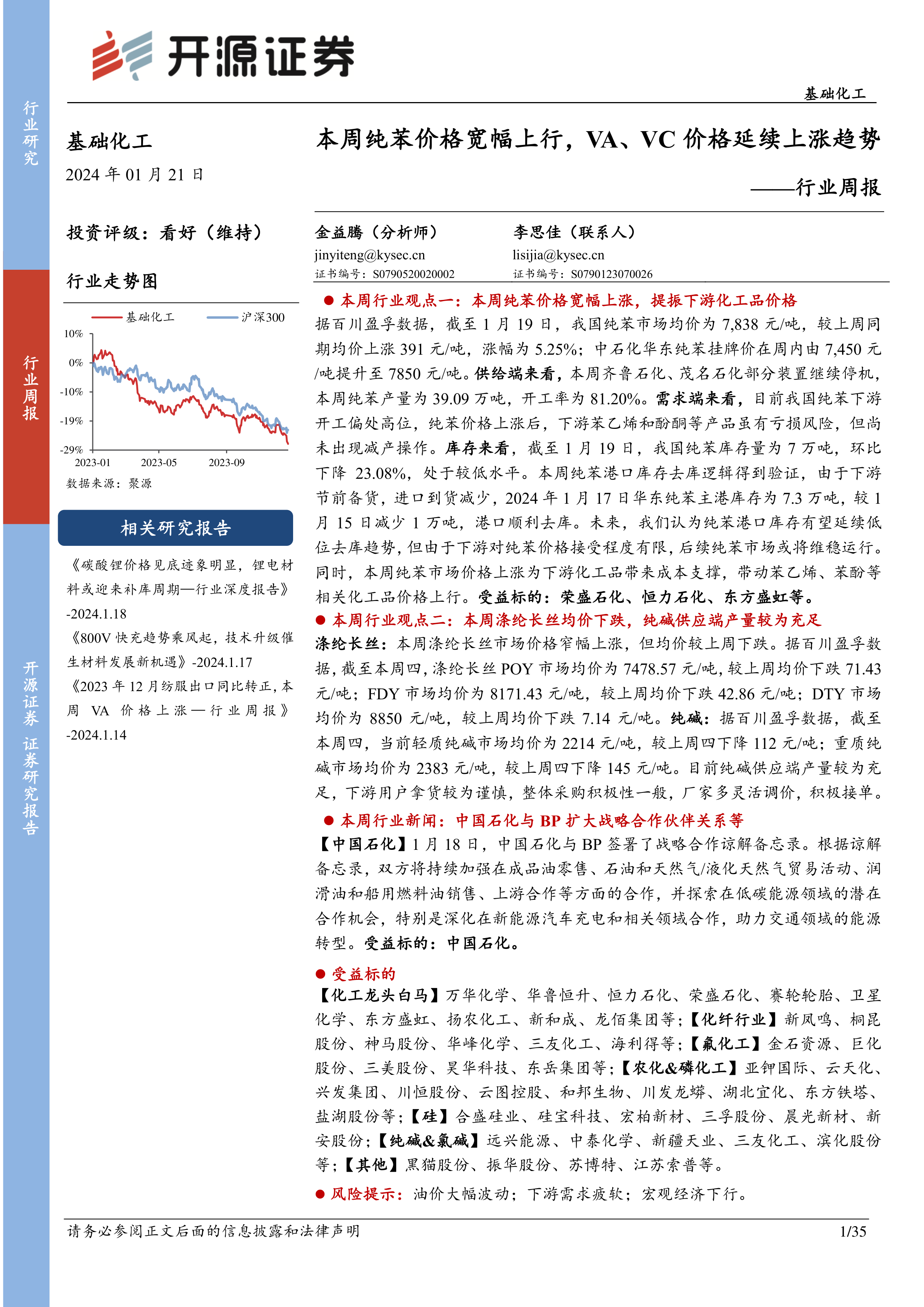 基础化工行业周报:本周纯苯价格宽幅上行,VA、VC价格延续上涨趋势