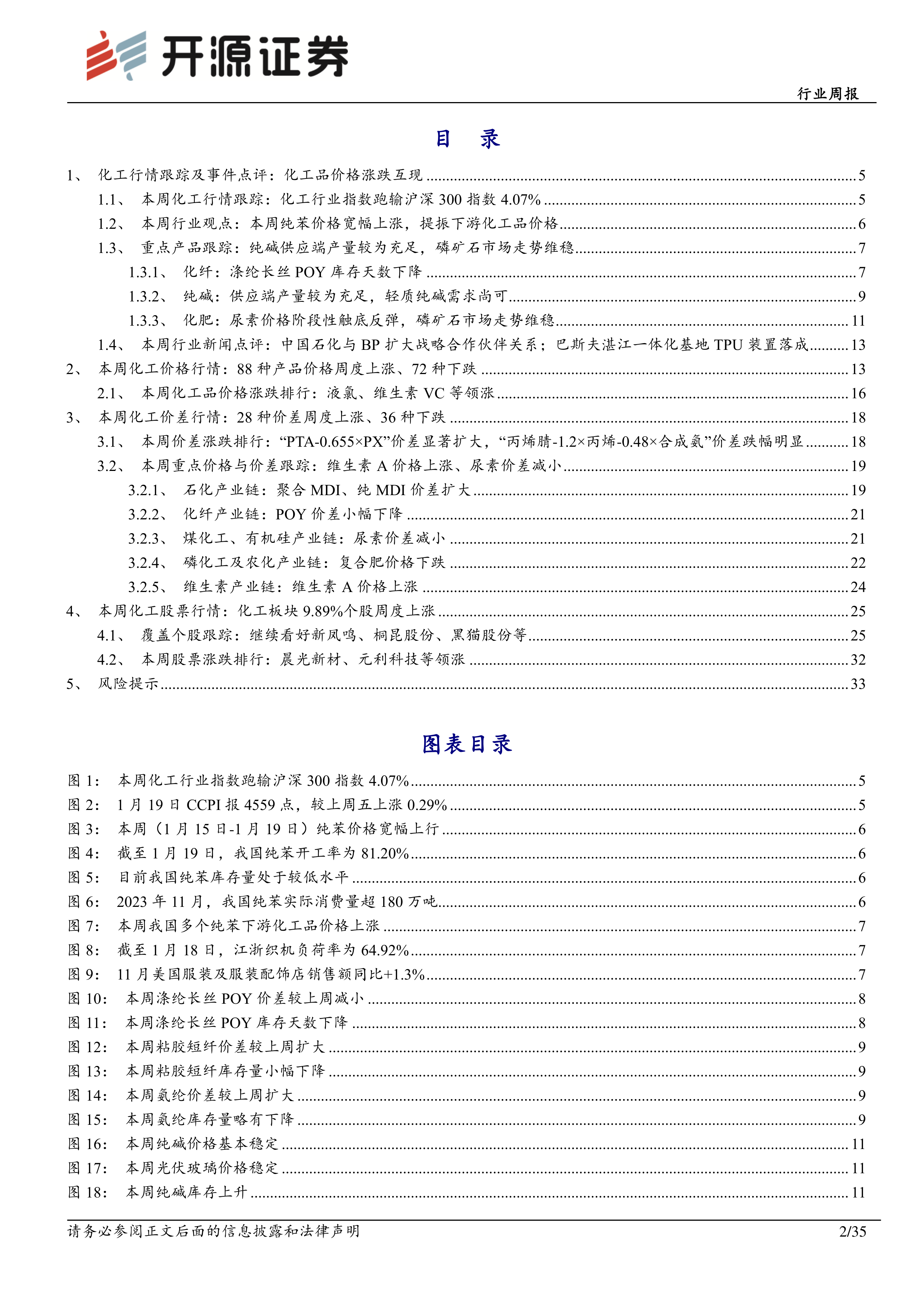 本报告的核心观点是:基础化工行业本周价格涨跌互现,纯苯价格大幅上涨,带动下游苯乙烯、苯酚等产品价格上行,但涤纶长丝价格下跌,纯碱价格也出现下降。整体来看,行业走势分化明显,部分产品受成本支撑和库存去化影响价格上涨,部分产品则受需求疲软和供应充足影响价格下跌。 未来纯苯港口库存有望延续低位去库趋势,但下游接受程度有限,价格或将维稳。